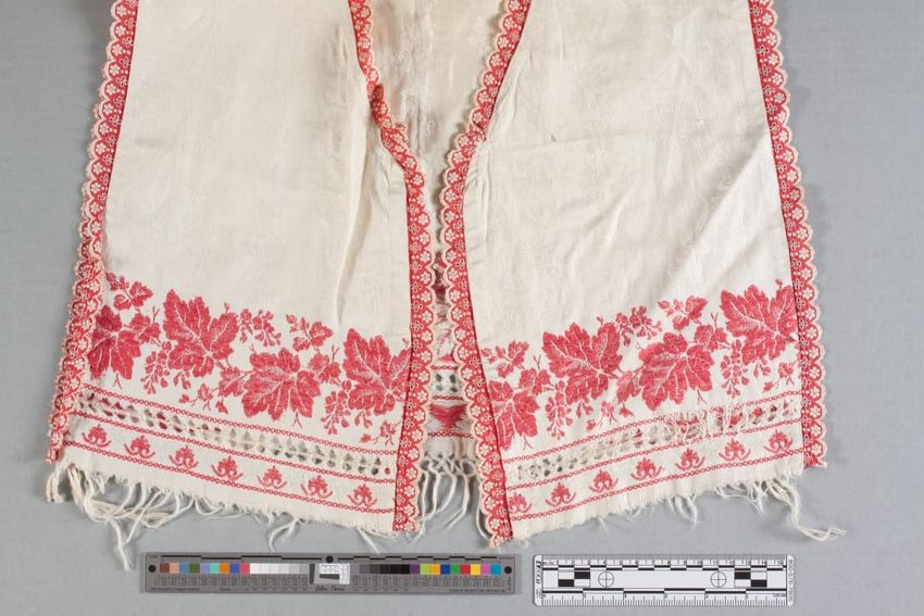 White cotton corset cover with interwoven ribbon in the interior neckline and an embroidered floral pattern on the front and along the scalloped armscye. Monogrammed "GP" for Georgiana Paine, possibly for her 1913 trousseau.
