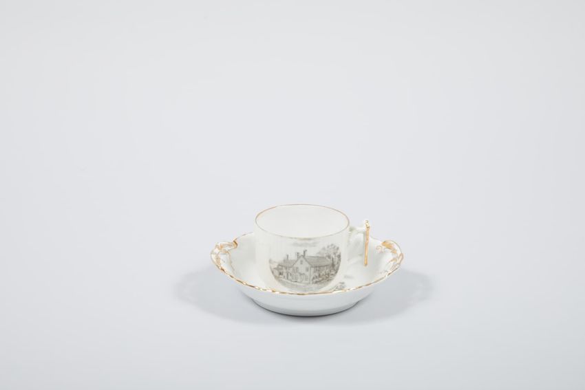 Souvenir Coffin house teacup and saucer, sold by George Osgood, Newburyport, Massachusetts. White porcelain with gold leaf decoration on edges of both cup and saucer. Black and white transfer pring image of Coffin House on side of cup and center of saucer bowl. Three floral illustrations on saucer.