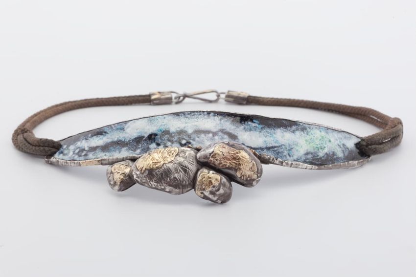 Gorget-style necklace made from central enamel pendant set in a silver frame with gold embellishments. Gorget is suspended on a Japanese silk braided cord with a silver and gold handmade hook and eye clasp. Enamel plaque marked on back by Matsukata with year (numbers reversed). Silver frame stamped ...