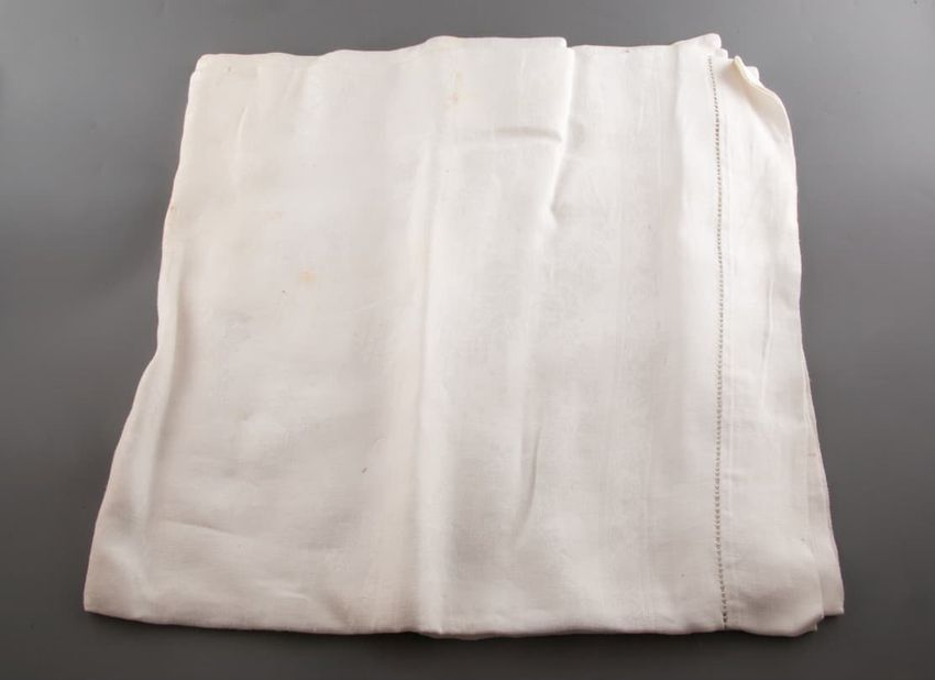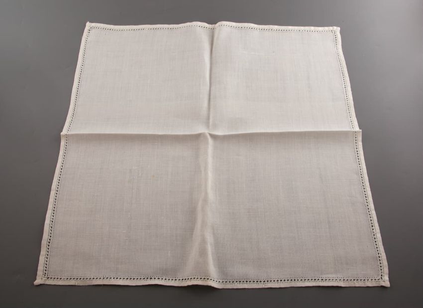 Square white linen tablecloth in a plain weave with 2 3/8" deep hems with a row of openwork at the top of the hem.