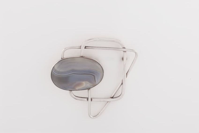 This brooch is formed from a single piece of silver wire hammered into an abstracted geometric shape. A large grey banded agate is bezel-set offcenter. Closure is a pin and safety clasp soldered to the back of the agate bezel. Marked.