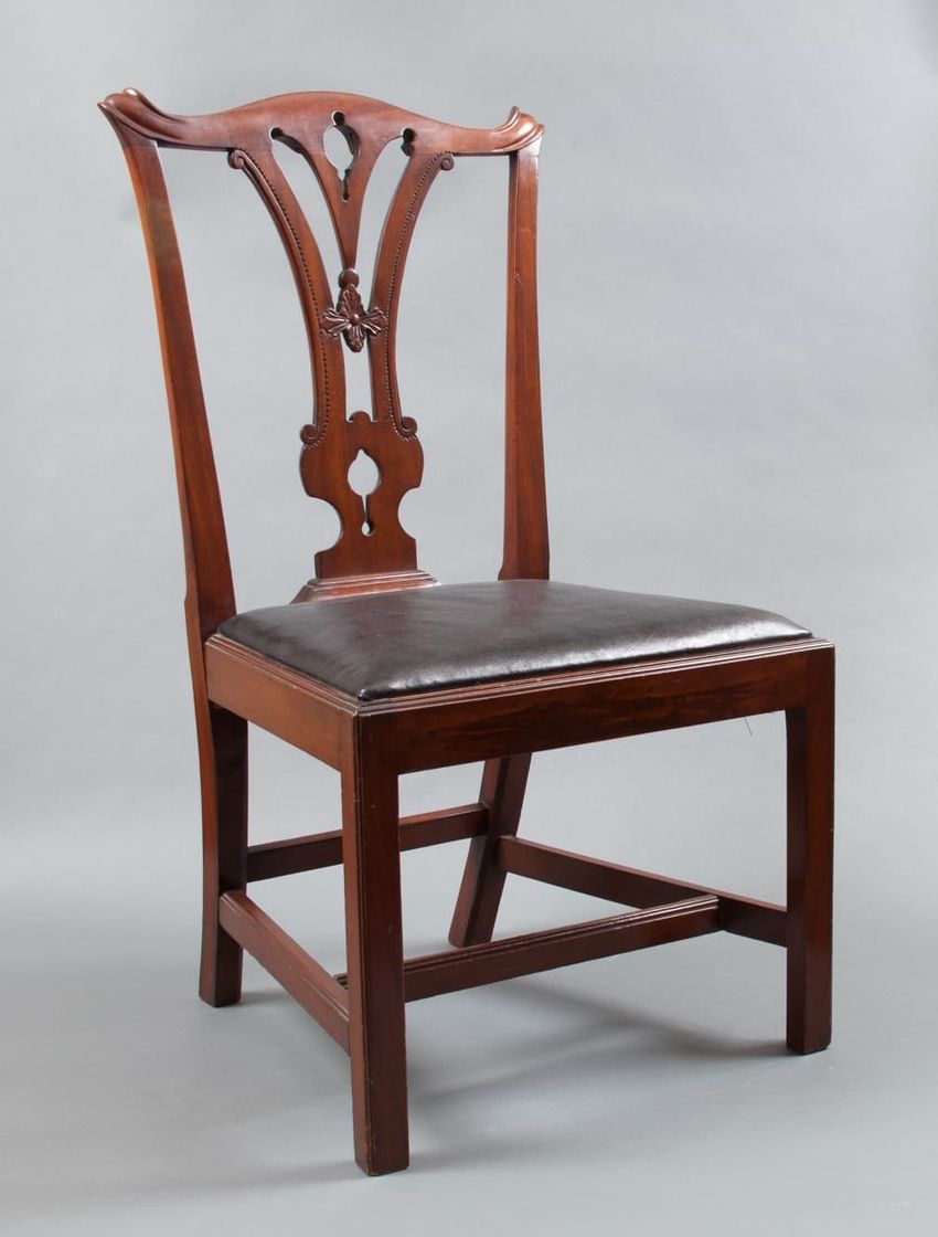 Mahogany Chippendale side chair, serpentine crest, carved and pierced splat, slip seat with black leather, reeded surround, marlborough legs, H-shaped stretcher.
