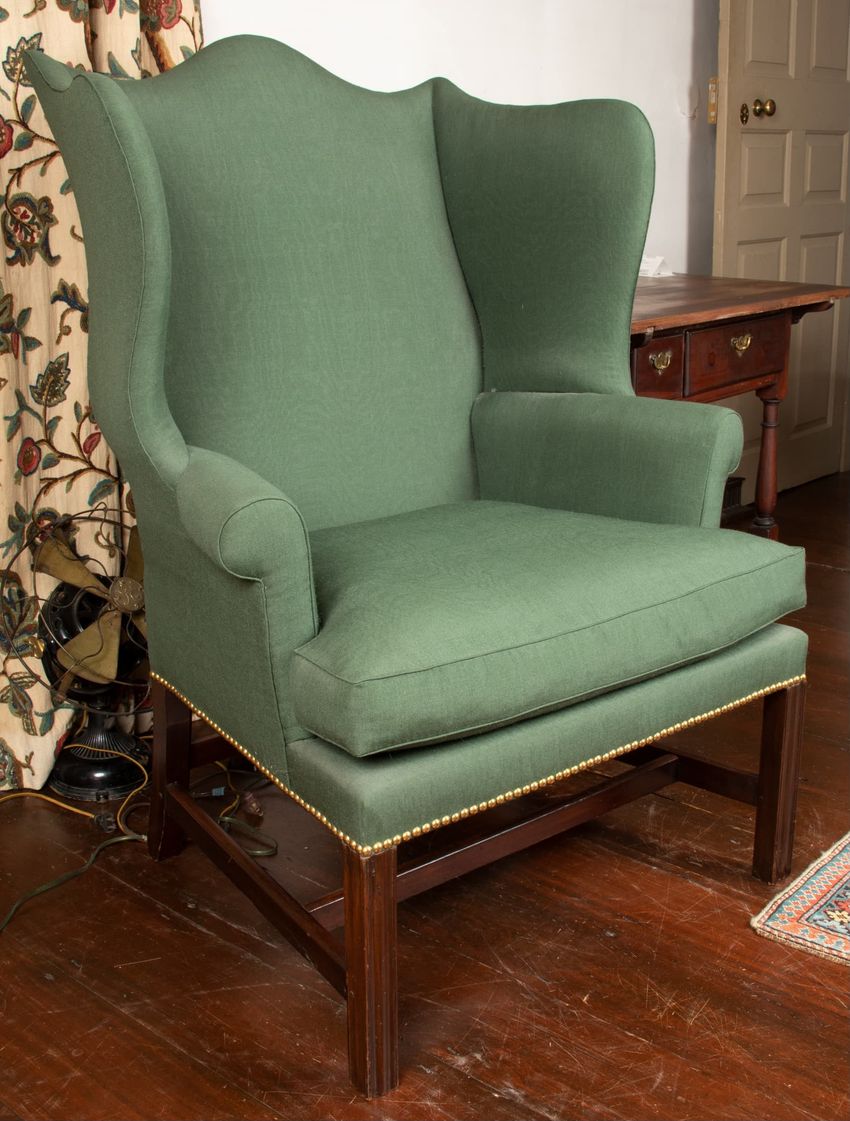 Queen Anne walnut side chair, shaped crest, vasiform splat, balloon seat, with slip seat, cabriole legs with shaped brackets and pad feet, turned h-shaped stretcher, probably Boston.