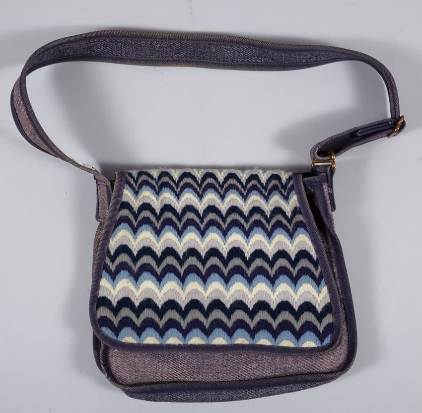 Embroidered denim purse with adjustable strap; machine sewn, satchel-style with flap; white, blue, lavender and gray; concentric wavy line pattern embroidery on flap; white interior with small denium pocket; manufacturer's label on interior.