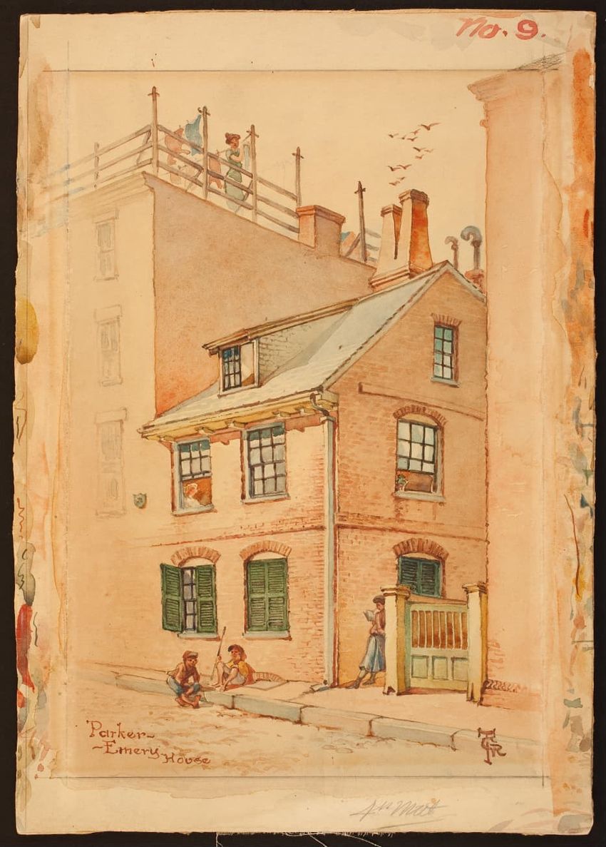 Well-detailed picture of two sides of house, circa 1800. House predominantly purple, stonework along road shown, also cellar wall. WPA HABS project # 52. [IN 951/334-44.]