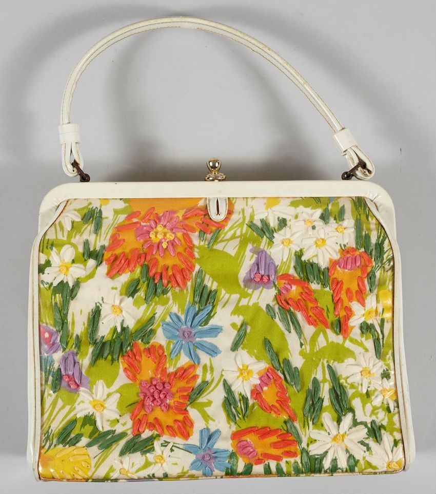 A white leather purse with abstract printed floral fabric on the sides. Floral fabric is adorned with stitched raffia and covered with clear vinyl and white leather handle and metal clasp.