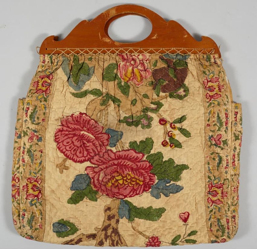 Quilted fabric purse with floral pattern and bird on white background and wooden handles.