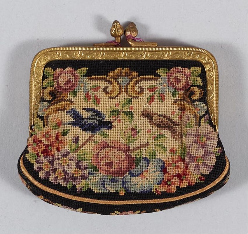 Petit point coin purse with birds and flowers on a cream and black background with yellow metal chased closure frame and clasp.