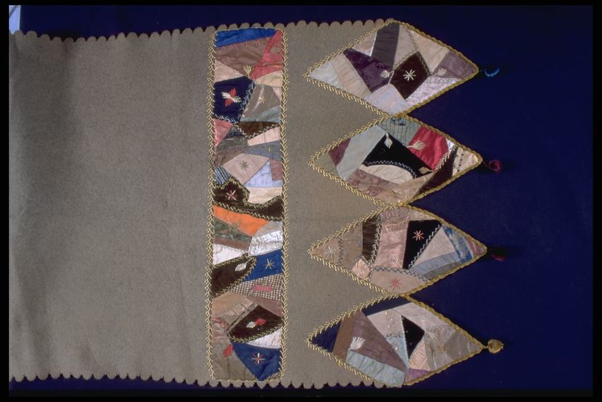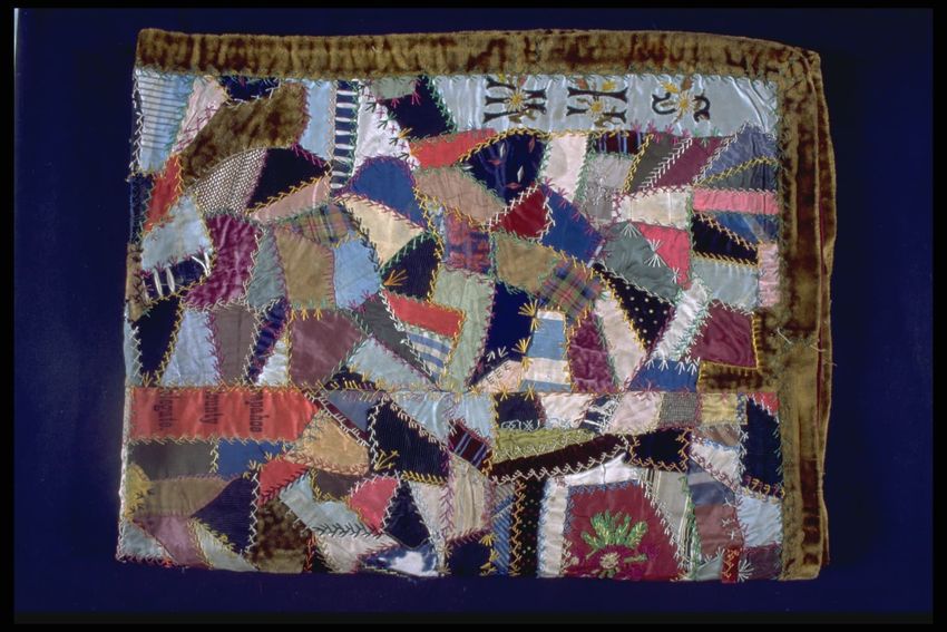 "Crazy quilt," multi-colored, gold plush border, two commemorative ribbons sewn in. Various embroidery. Red wool lining on back.