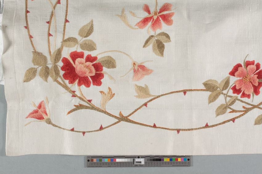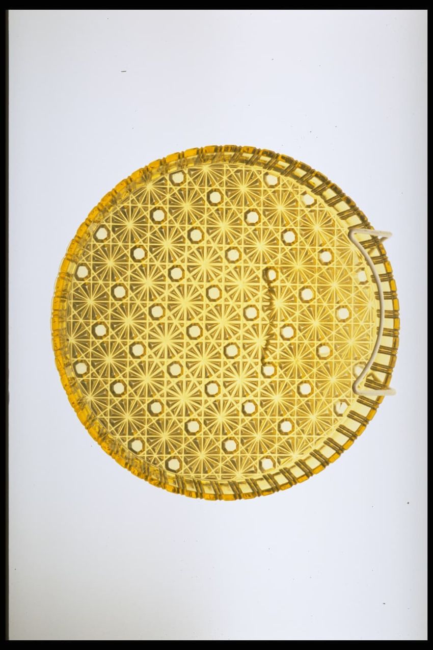 Large, footed porcelain bowl painted with underglaze blue foliage and rockwork bluish-clear glaze. Overglaze iron reds and gilding forming scene of peacocks (?) in Kakiemon style rockwork, sprigs pf blossoms (prunes), peonies, and bridge in background. Interior rim of bowl decorated with lattice b...