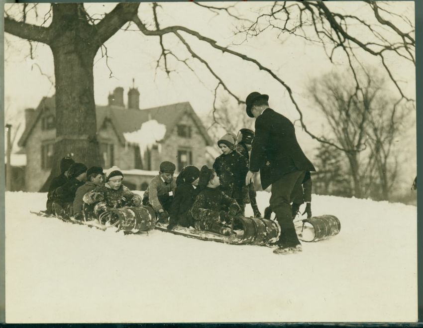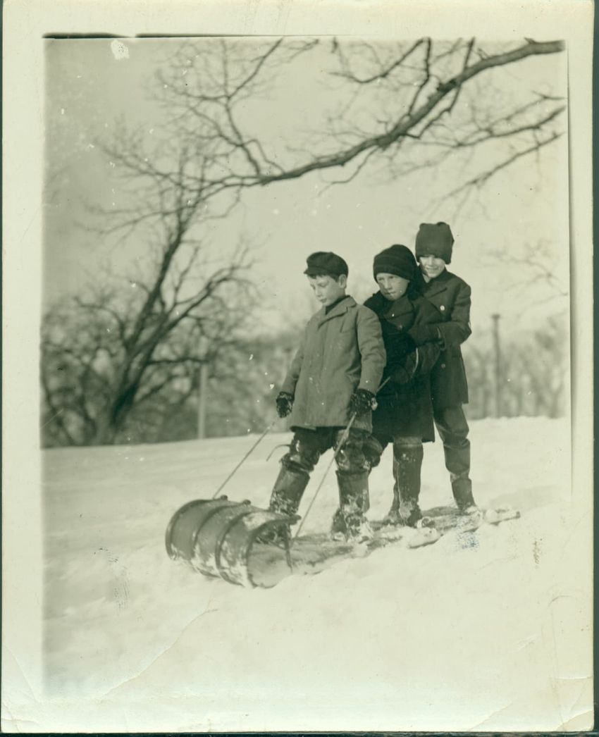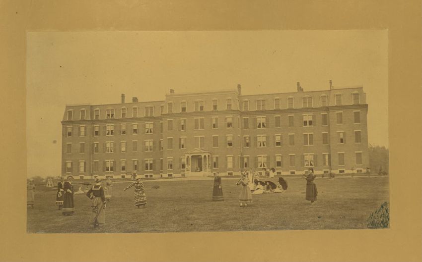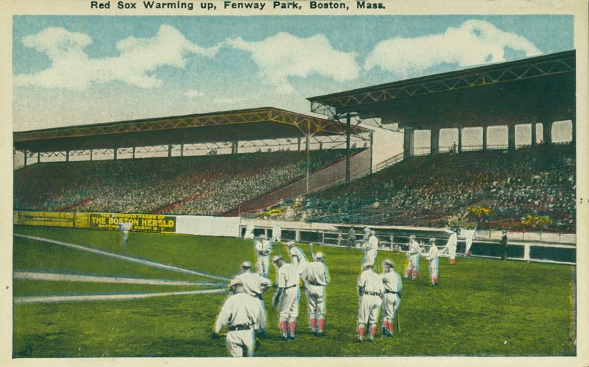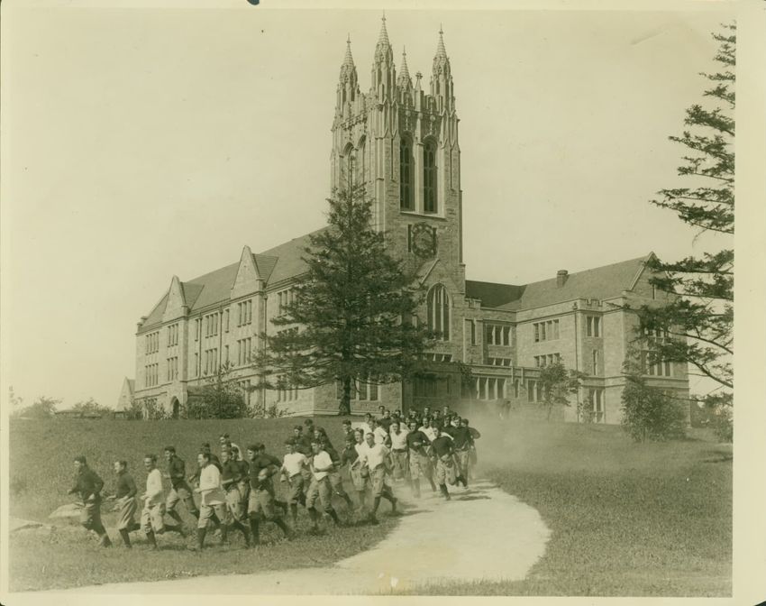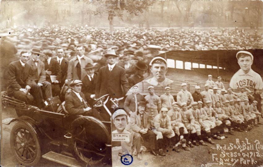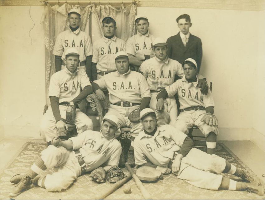 Ten members of the Harvard College baseball team in uniform pose for a group portrait with a undecorated backdrop. They are arranged in three rows of players, one each sitting on the floor, sitting in chairs, and standing. One of the seated players holds a catcher's mask.