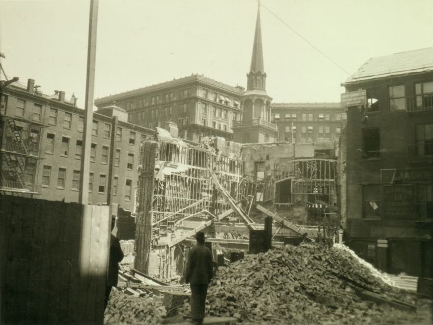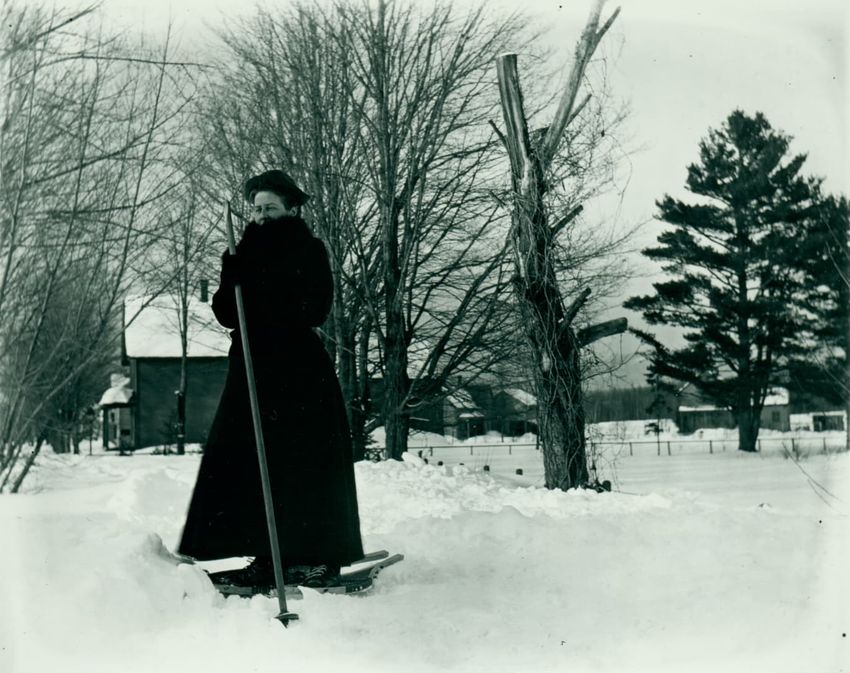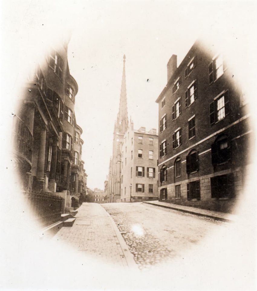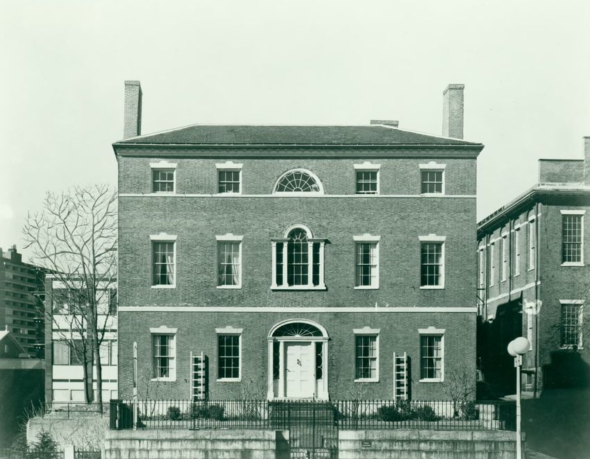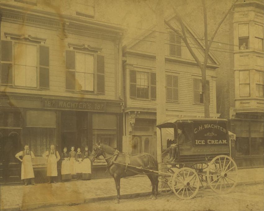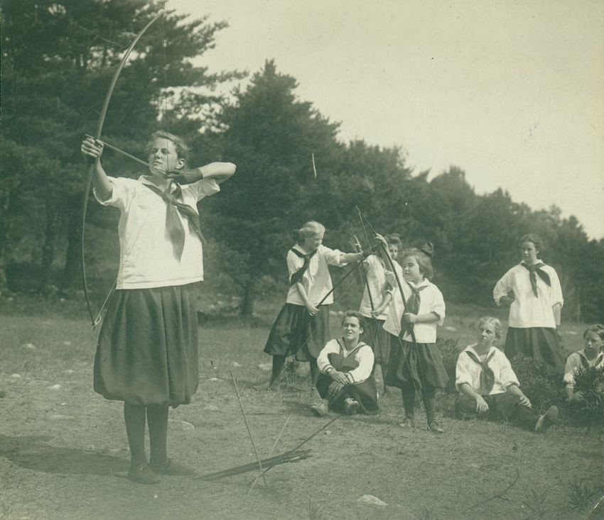 Ten members of the Harvard College baseball team in uniform pose for a group portrait with a undecorated backdrop. They are arranged in three rows of players, one each sitting on the floor, sitting in chairs, and standing. One of the seated players holds a catcher's mask.