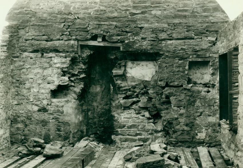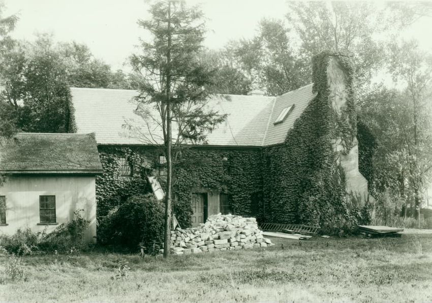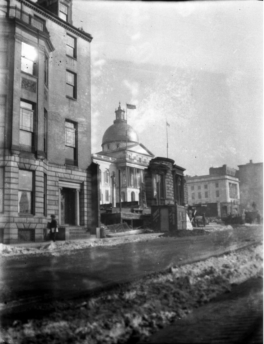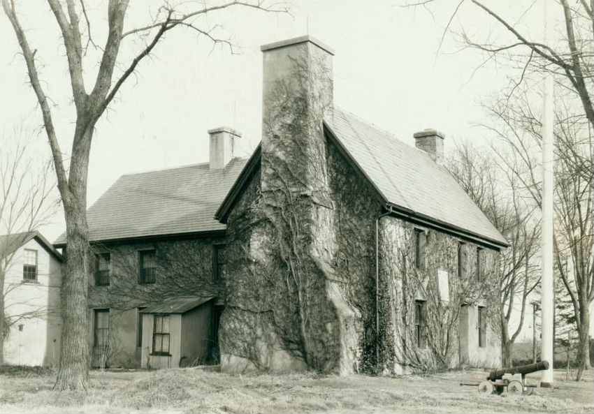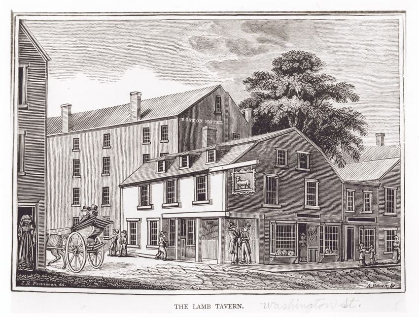 A photomechanical print of an engraving of Lamb Tavern, also known as the White Lamb, which was located on the west side of Washington Street, between West Street and Boylston Street, in Boston, Massachusetts. Two men converse in the doorway underneath the tavern sign while pedestrians pass by and a...