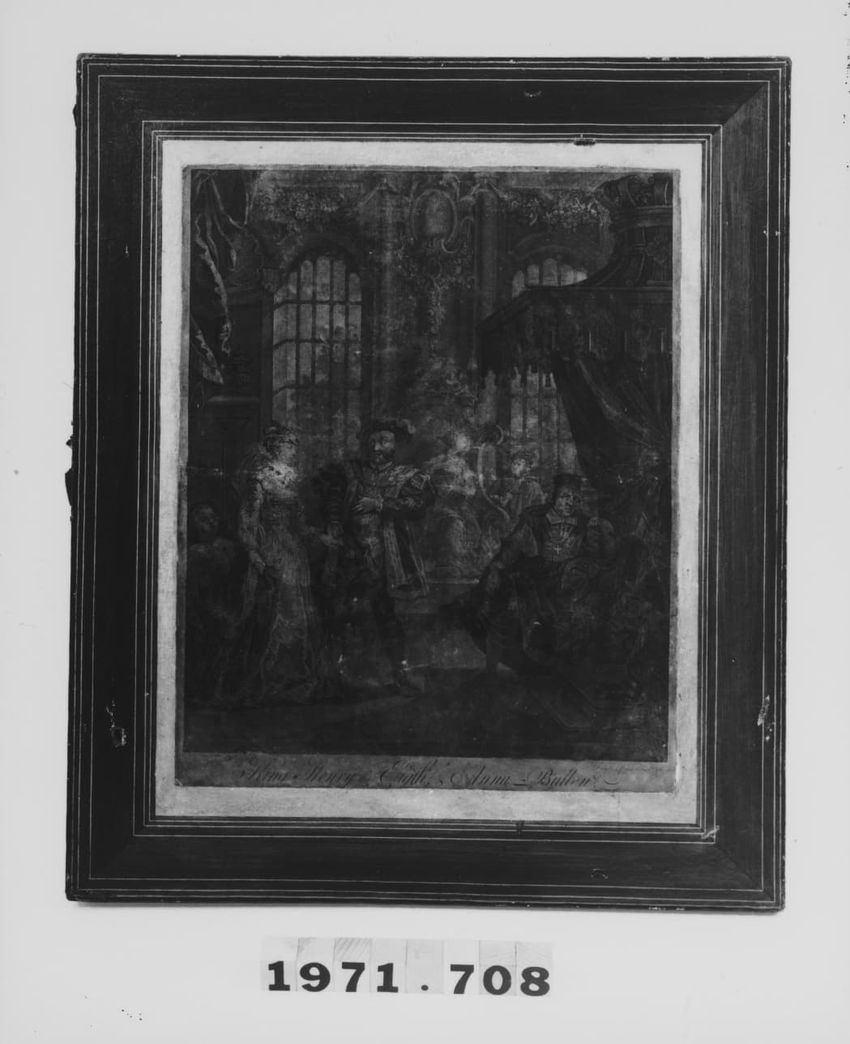Square linen sampler with light blue, dark blue, and tan two-ply cotton cross stitching. Top two rows have upper case alphabet, third row has numbers 1-18. Fourth row has lower case alphabet, fifth and sixth rows have stylized upper case script. Bottom border of blue diamonds. Matted and framed in g...