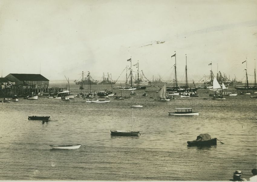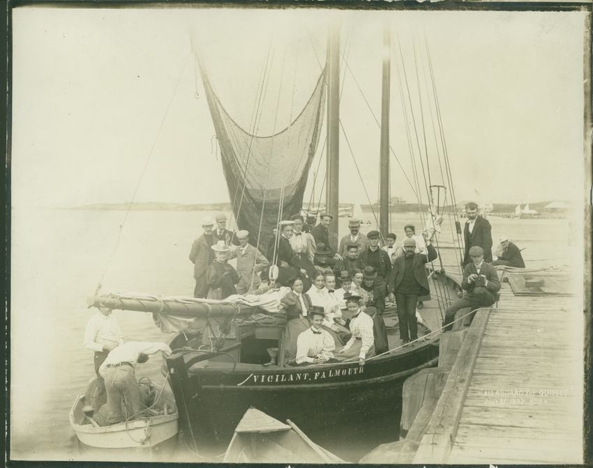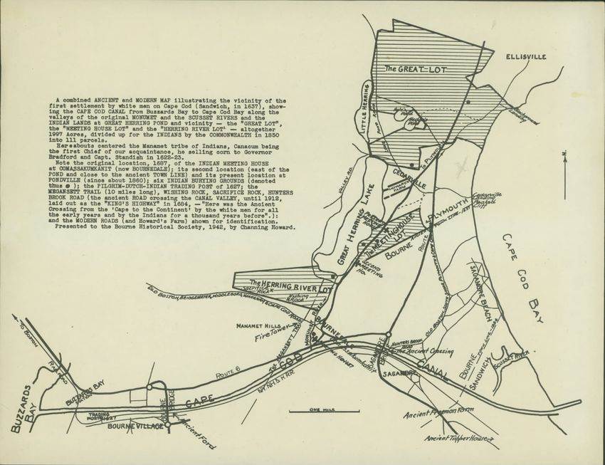 A map of Cape Cod showing ancient and modern details, by Channing Howard, presented to the Bourne Historical Society in 1942. The map provides details of old Cape Cod landmarks and settlements. The map includes three paragraphs of text. The first beigns: "A combined ANCIENT and MODERN MAP illustrati...