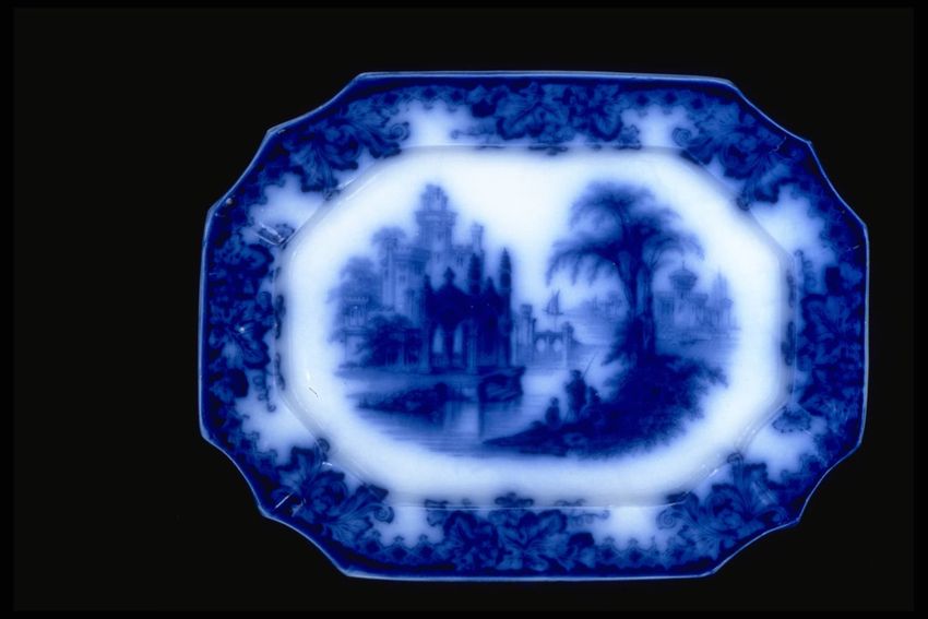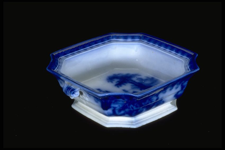 Ironstone? part of dinner set w/ flow-blue transfer-print designs in Gothic-revival style; all decorated w/ picturesque landscape w/ Gothic church by a river w/ trees and 2 figures in the foreground. Bowl w/ flared side.