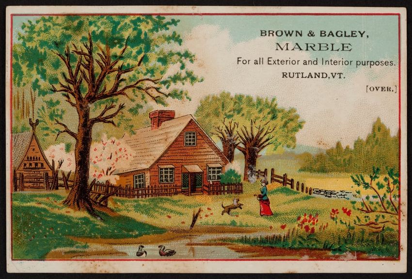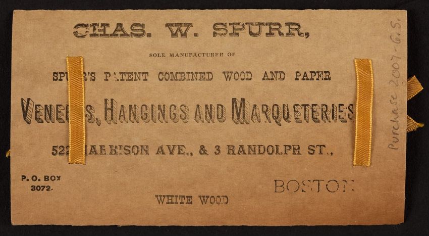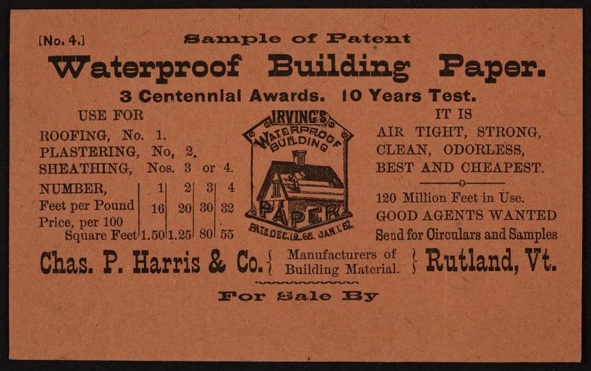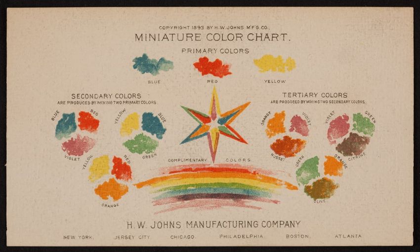 The trade card is for the Columbian Exposition in Chicago, July 1893. The front of the card is a color chart. The card verso lists the building locations of Johns Company exhibits in the fair. The company deals in roofing and building materials, steam packings, asbestos and fire-proof cements and co...