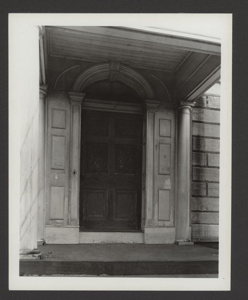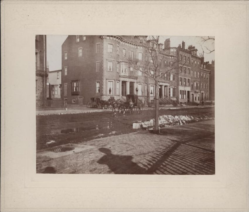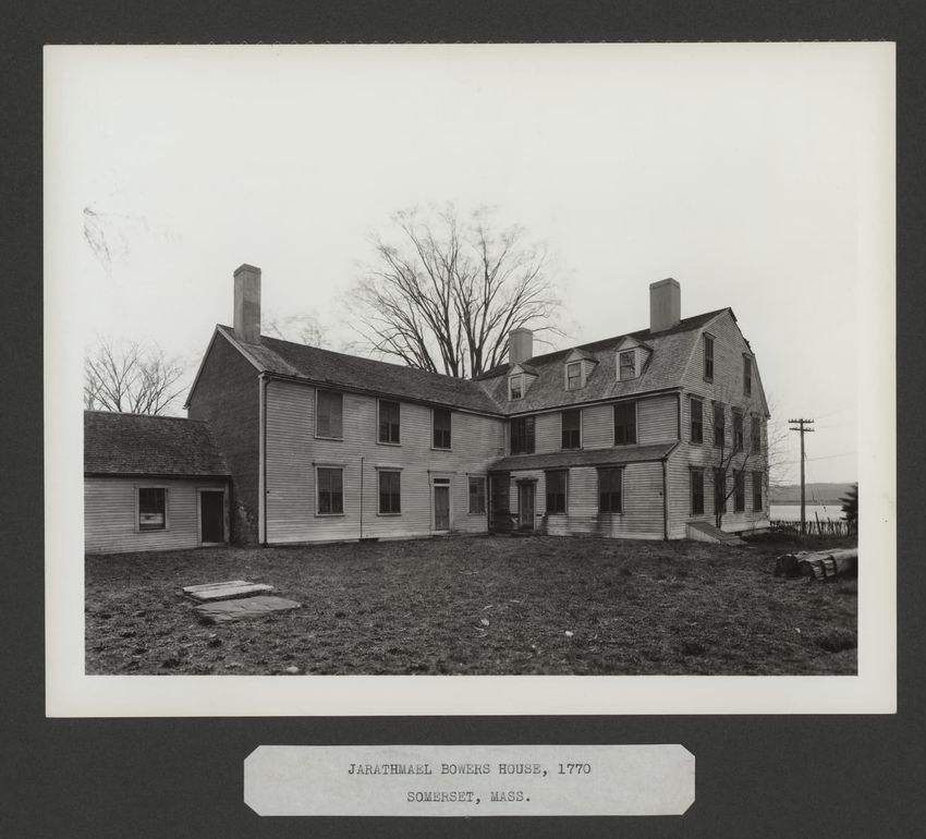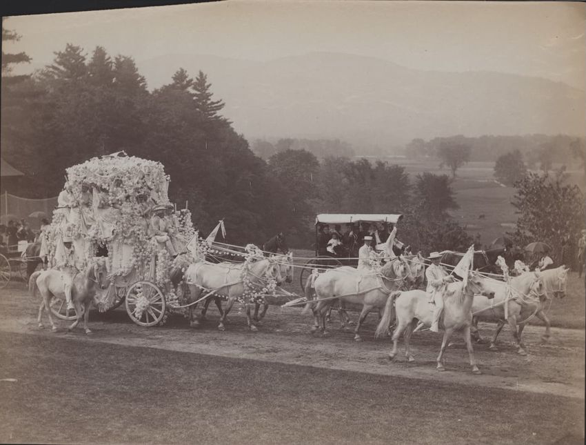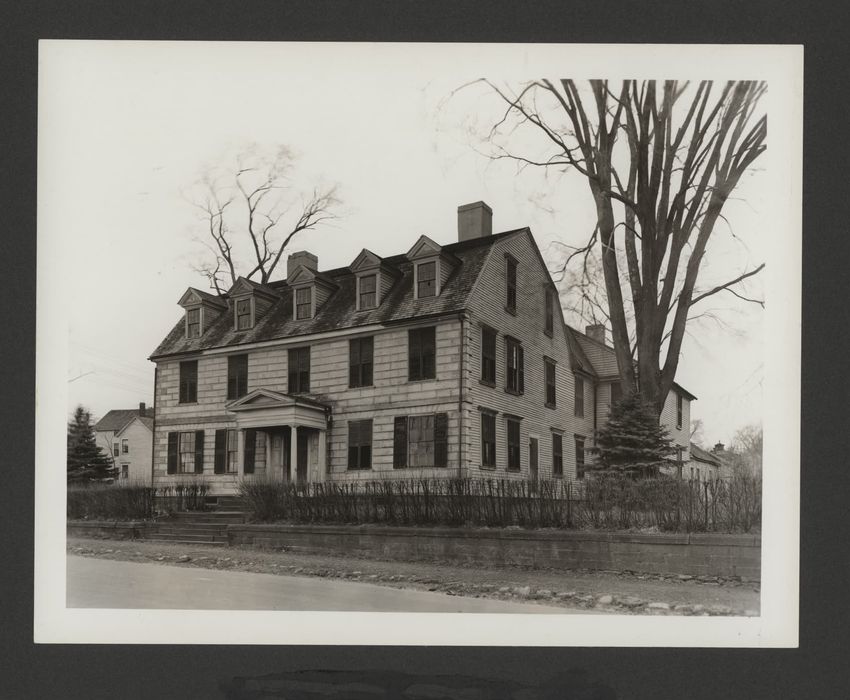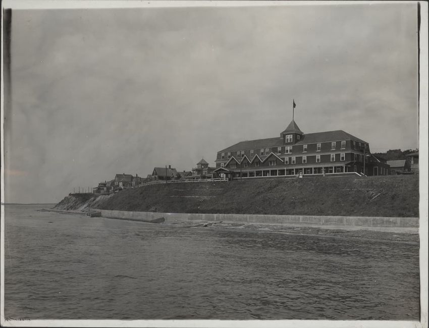 Exterior view of cedar trees in the neighborhood of West Chop, Martha's Vineyard, Massachusetts, with two figures. Both appear to be ladies with one dressed in light colors seen from behind and the other wearing dark clothing and carrying an umbrella while seated under the trees. The ocean can als...