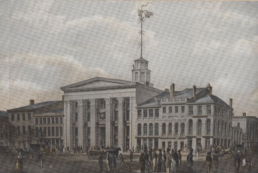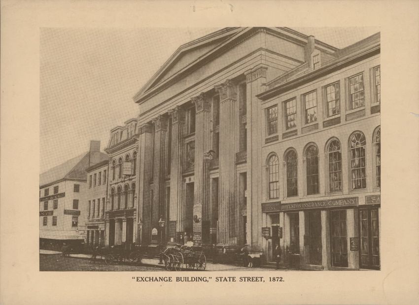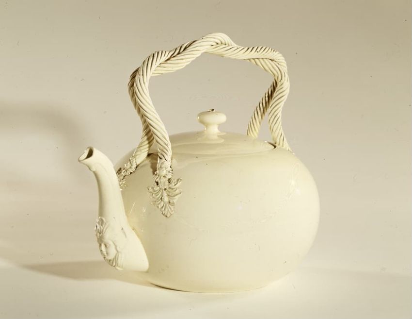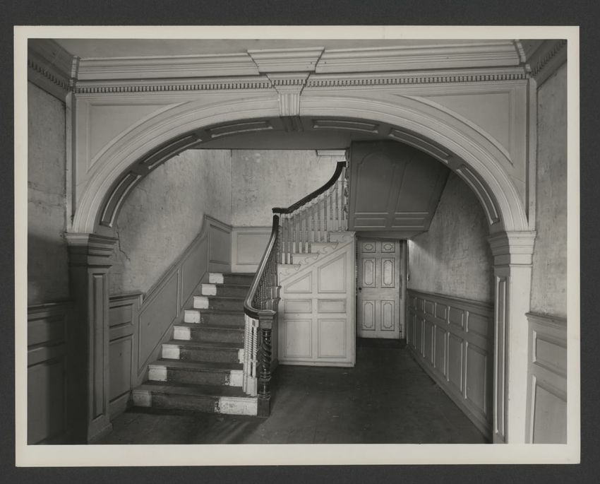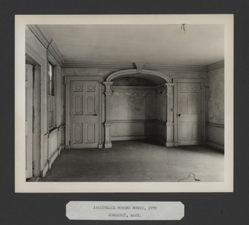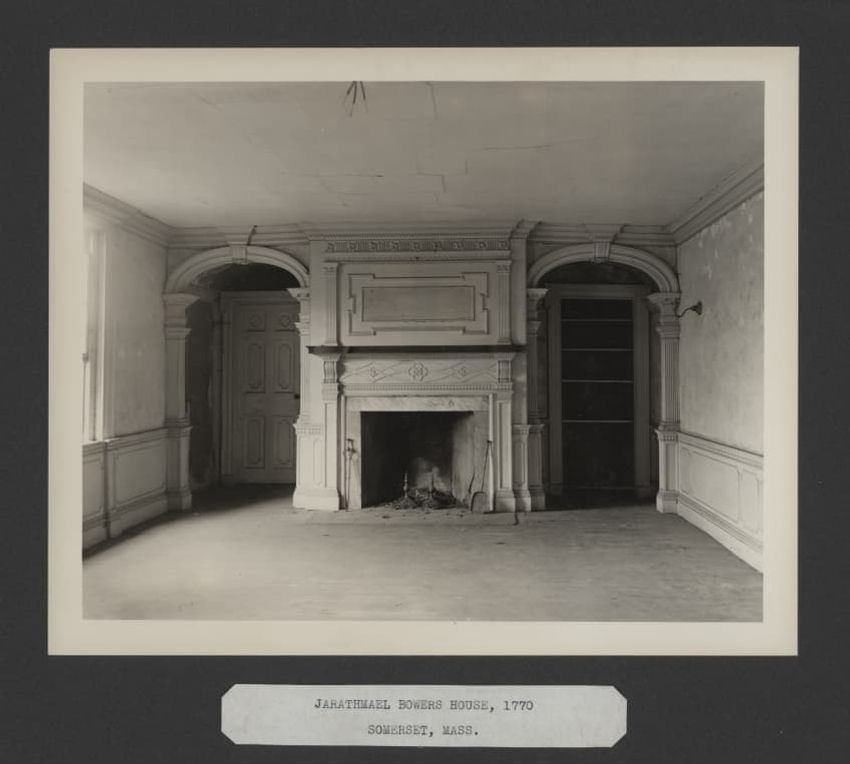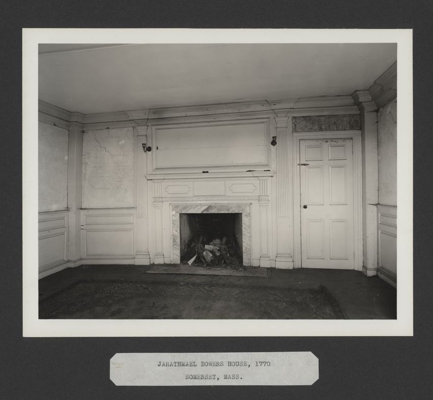 Exterior view of cedar trees in the neighborhood of West Chop, Martha's Vineyard, Massachusetts, with two figures. Both appear to be ladies with one dressed in light colors seen from behind and the other wearing dark clothing and carrying an umbrella while seated under the trees. The ocean can als...