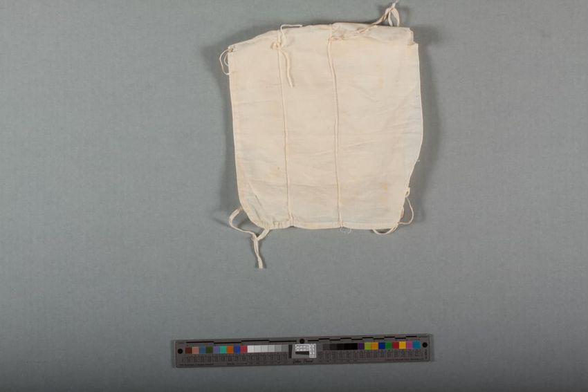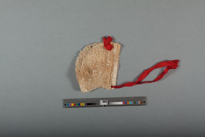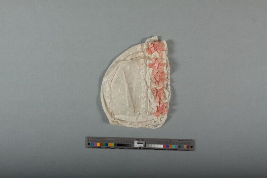 A pair of blue leather children's shoes with large rosettes, blue rucking trim, ankle straps, and white lining.