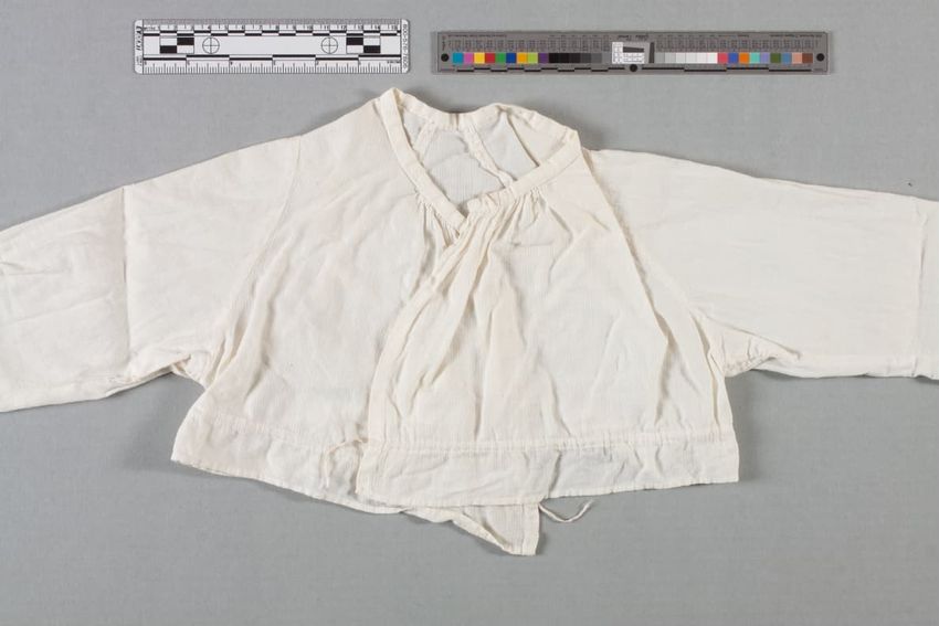 A young boy's wrapper made from roller printed cotton in a floral pattern of sprigs and bunches of flowers with red branches on a red and brown picotage ground. The gown is made like an adult banyan, with a squared neck and cartridge pleats set into it to form a soft, shawl collar. It is fully lined...