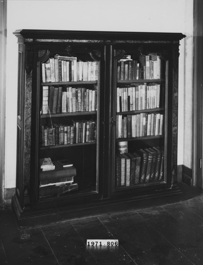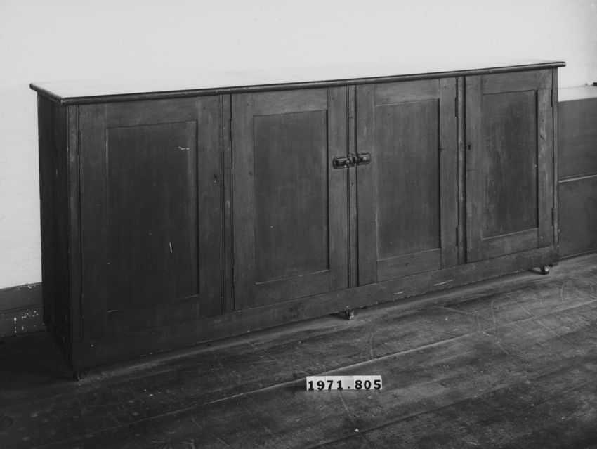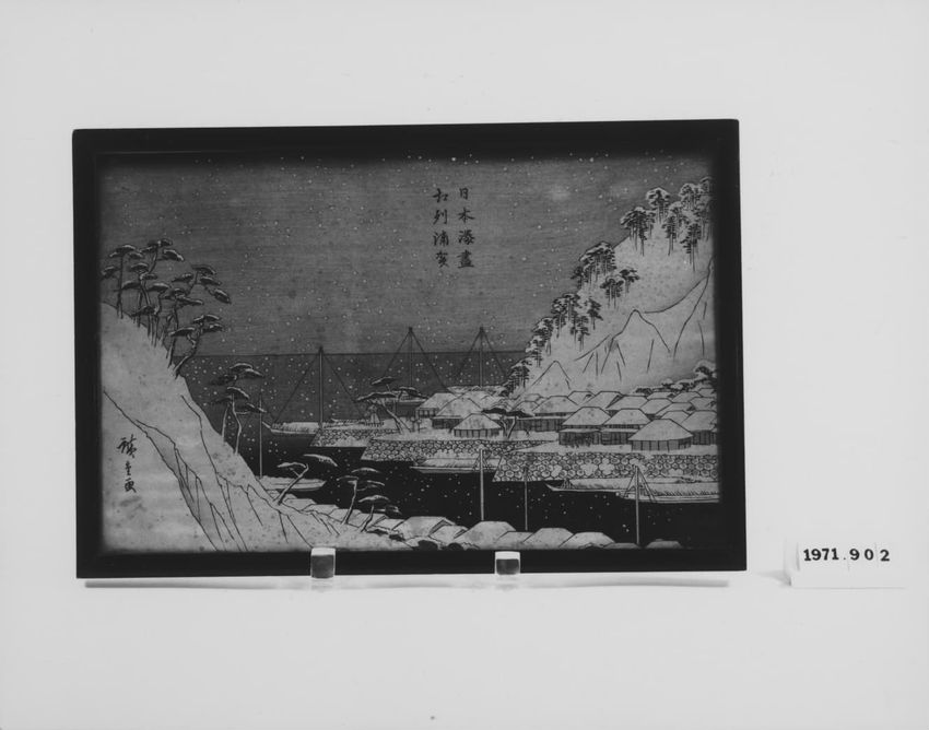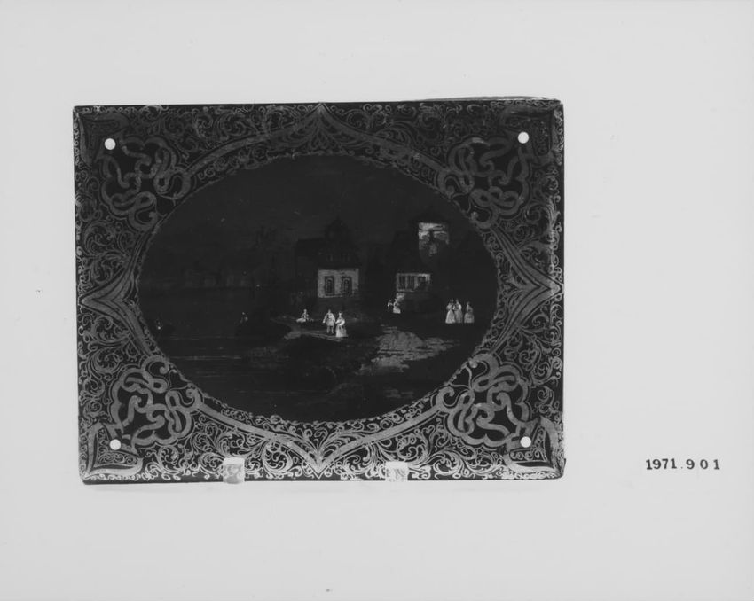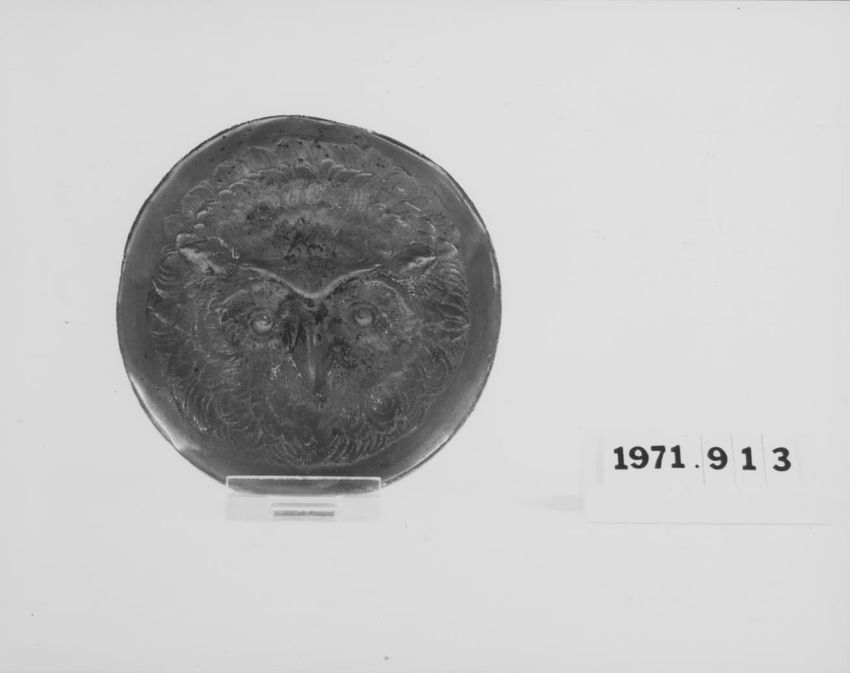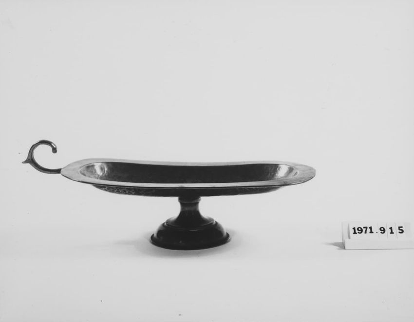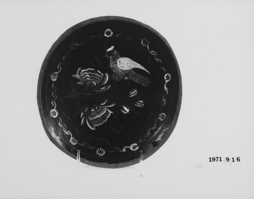 Carved, footless, wooden bowl; terra cotta exterior; black interior with painted bird and flowers; colors: blue, red, white and green.