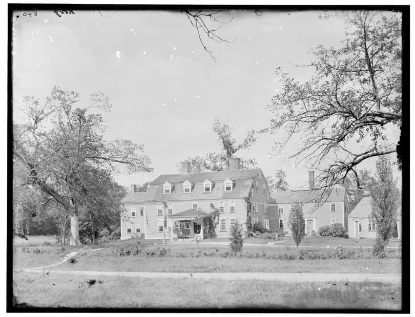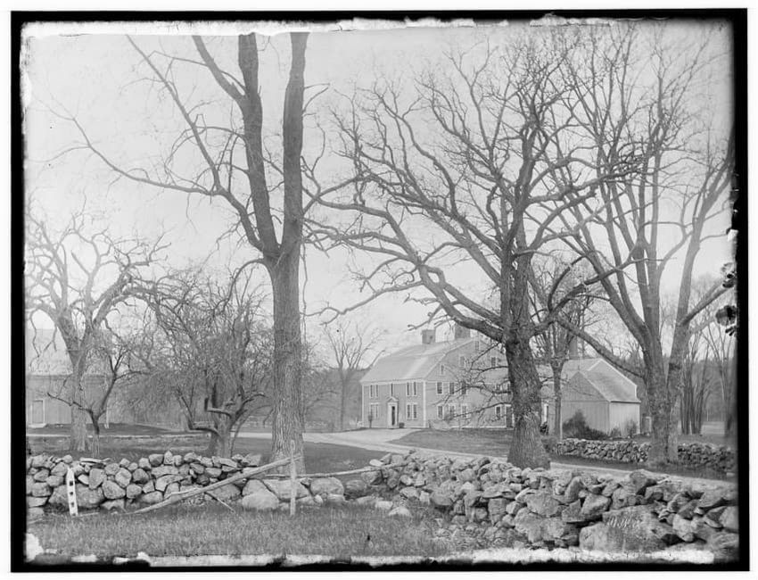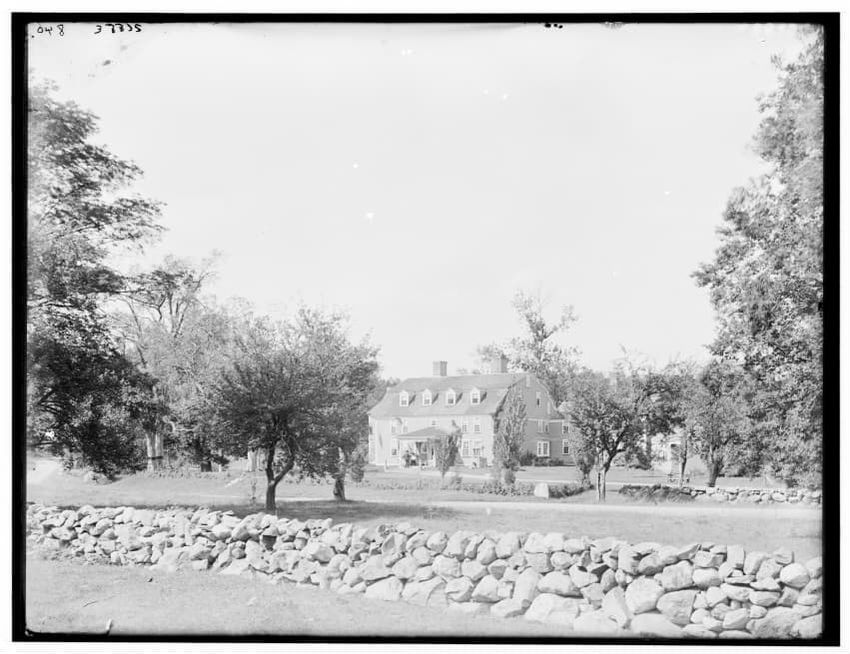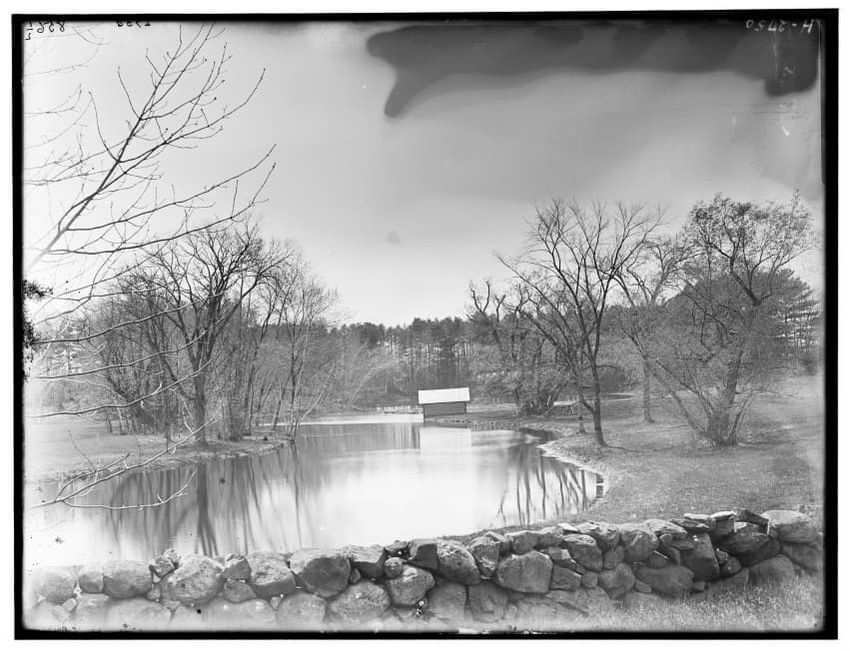The image shows Gore Place pond located at 52 Gore Street, Waltham, Massachusetts. In the foreground, there is a stone wall, and beyond it lies a body of water. Trees, some with bare branches, line the pond's perimeter, and a small structure with a peaked roof is situated near the water.