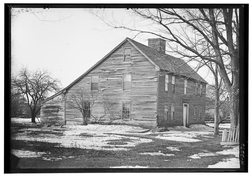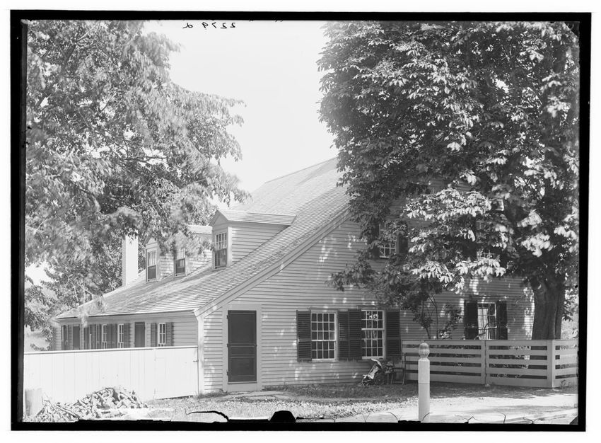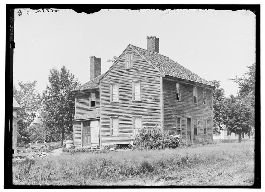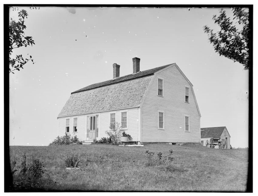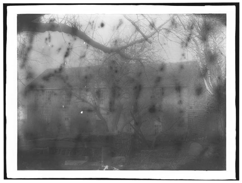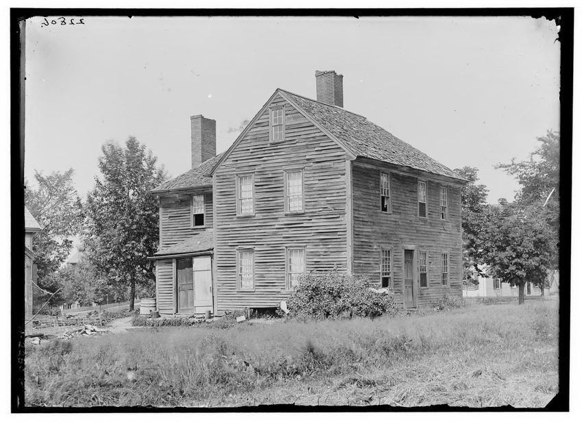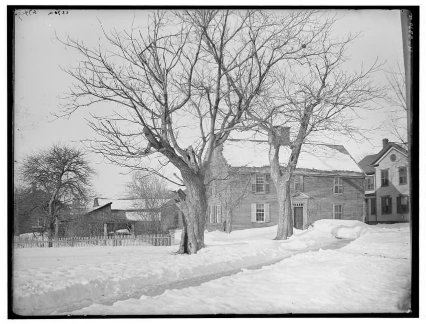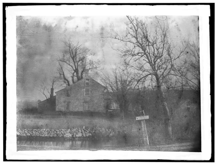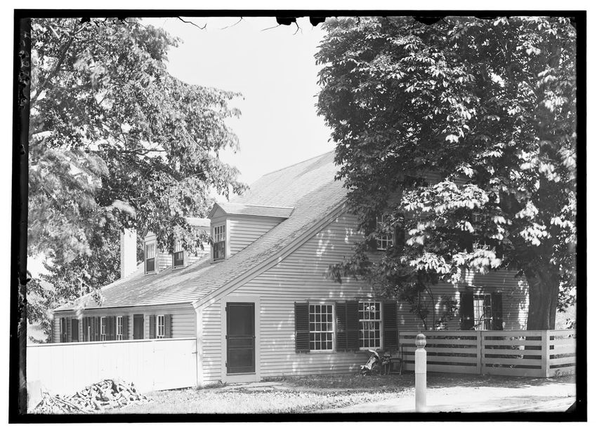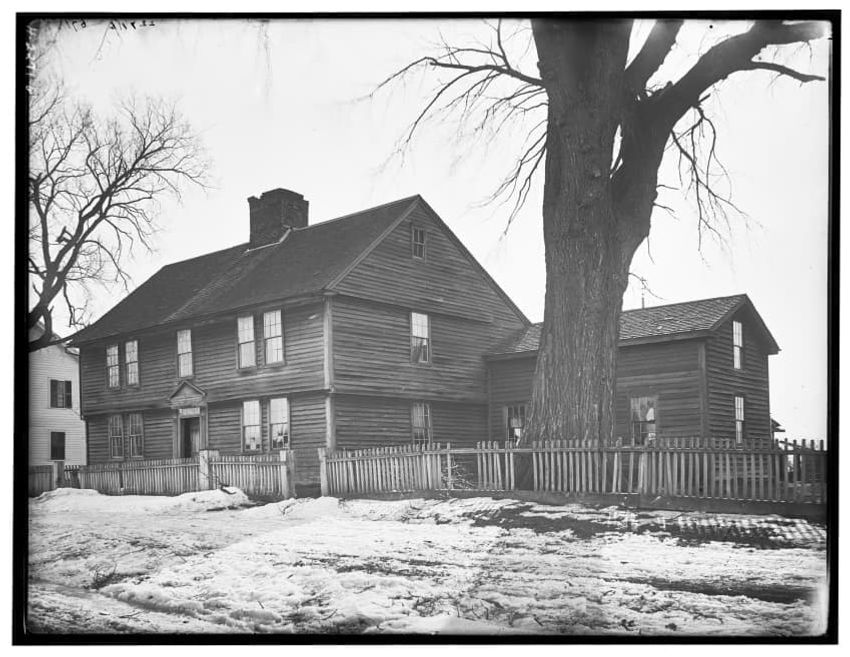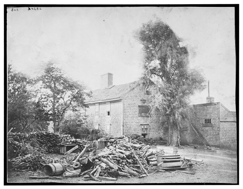 The image depicts Barker House in Pembroke, Massachusetts. The structure is a wooden, shingled building with multiple windows, located next to a large tree. In the foreground, there is a substantial pile of chopped wood, barrels, and crates scattered around the area.