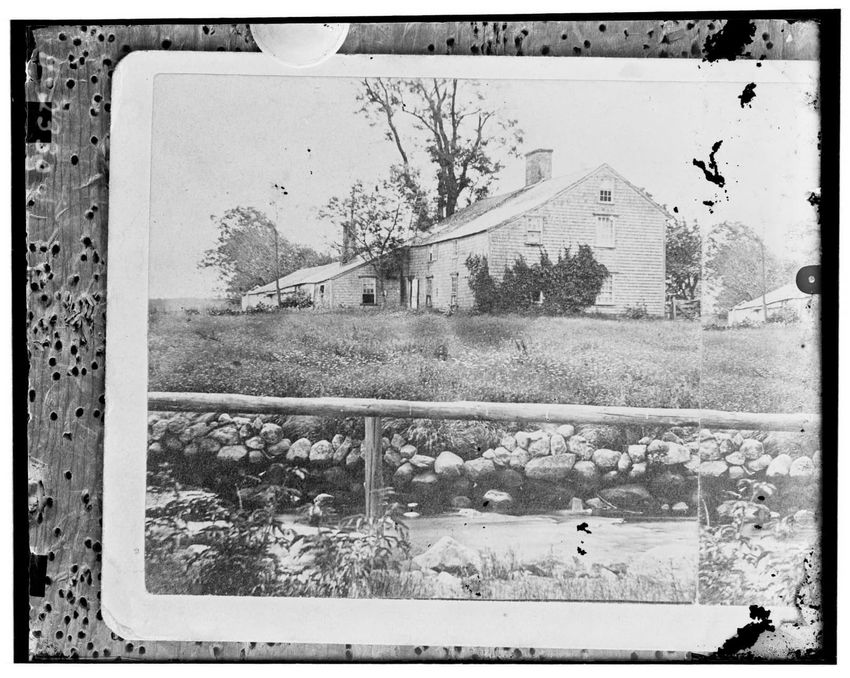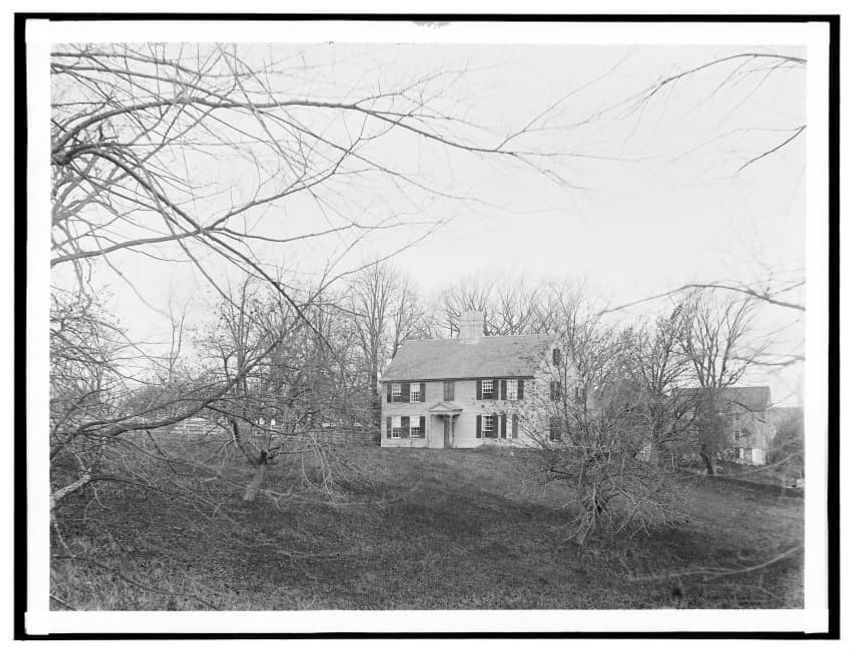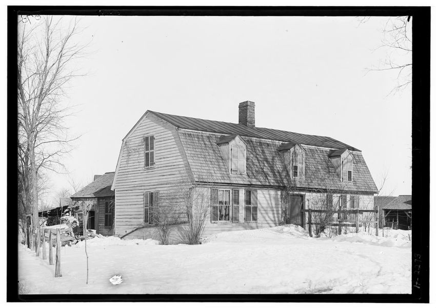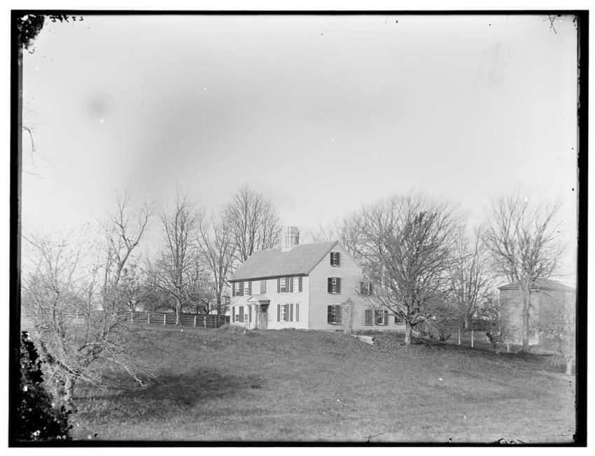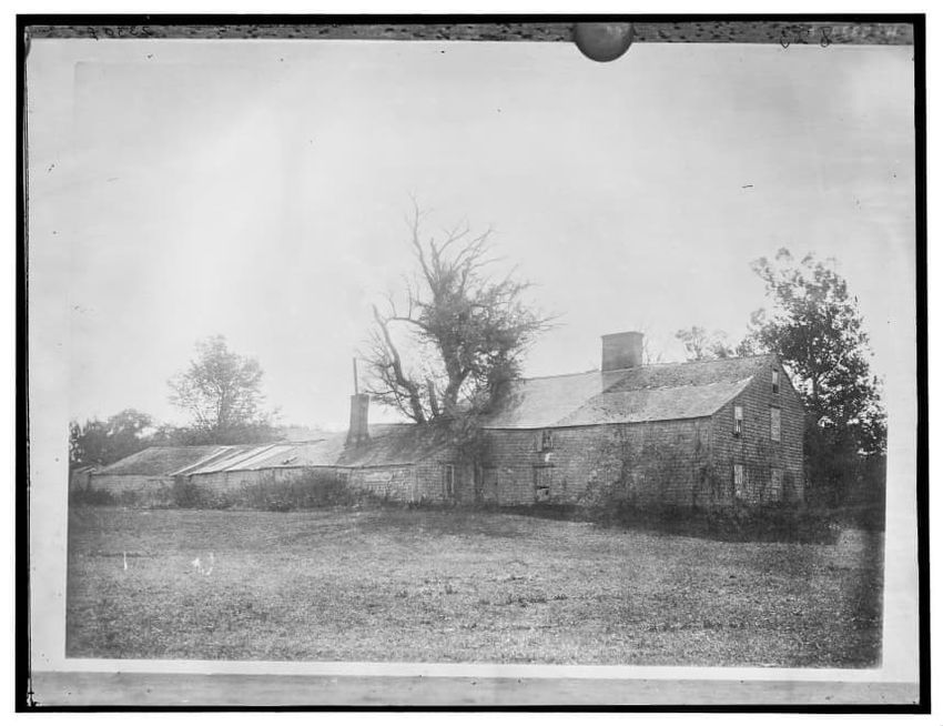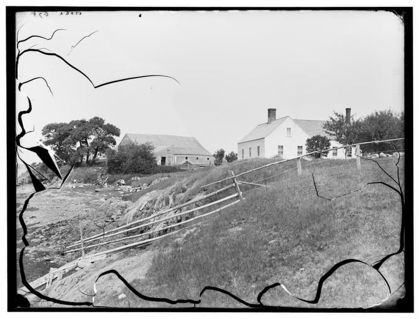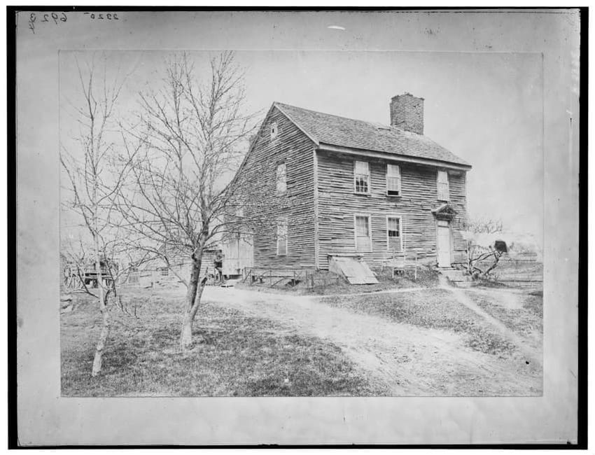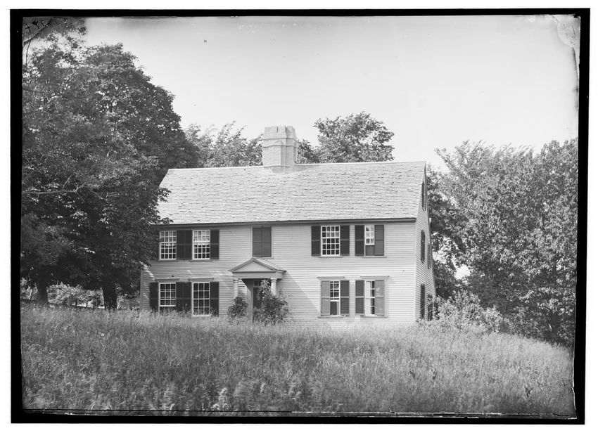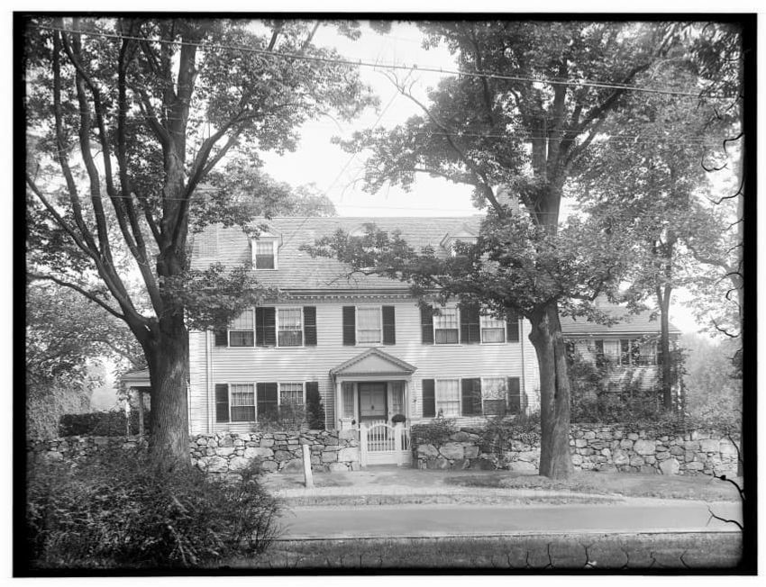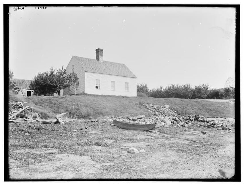 The image depicts Barker House in Pembroke, Massachusetts. The structure is a wooden, shingled building with multiple windows, located next to a large tree. In the foreground, there is a substantial pile of chopped wood, barrels, and crates scattered around the area.