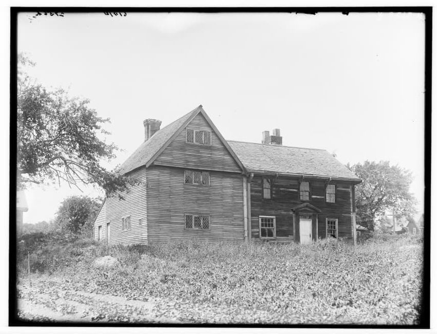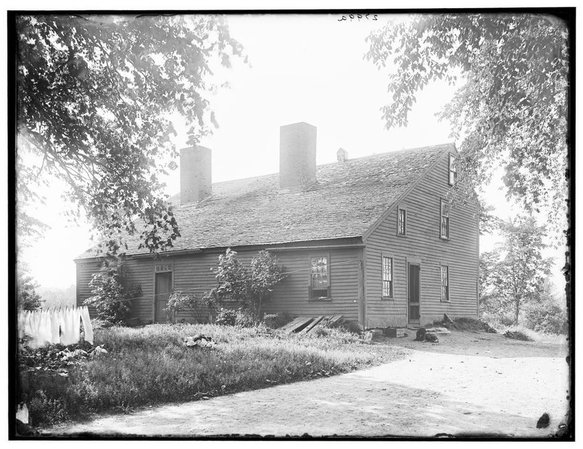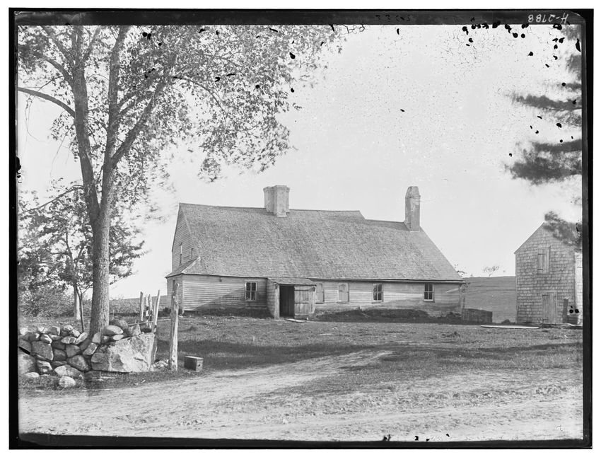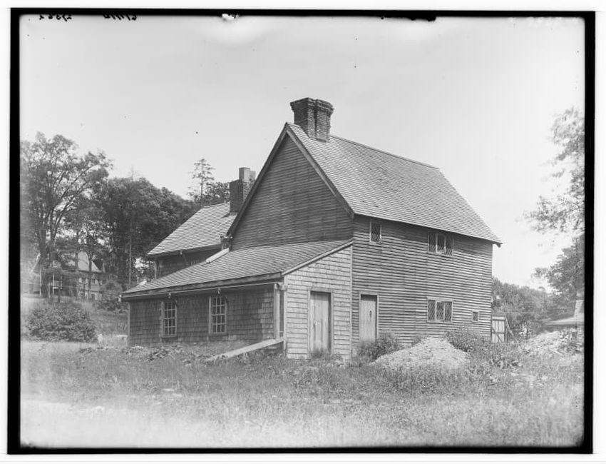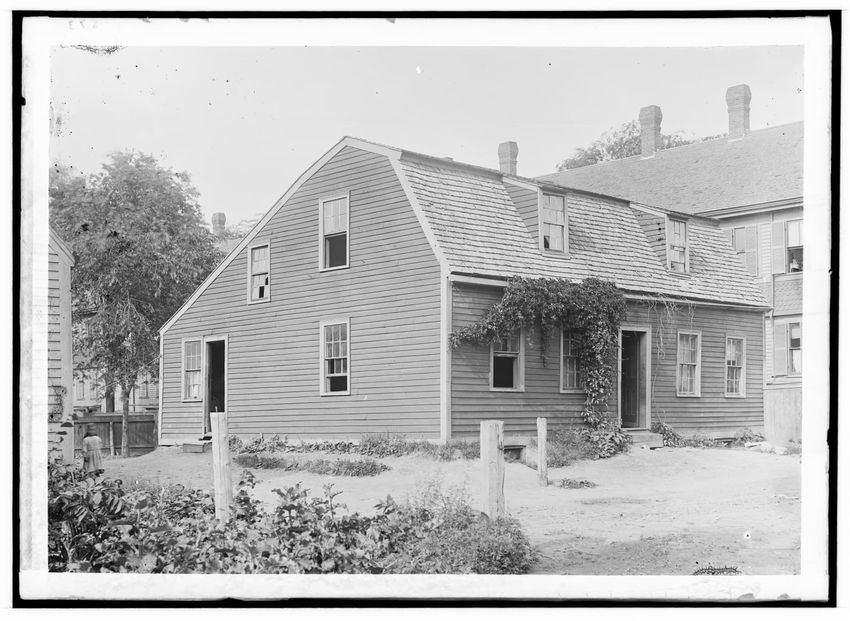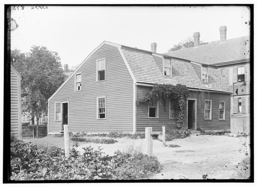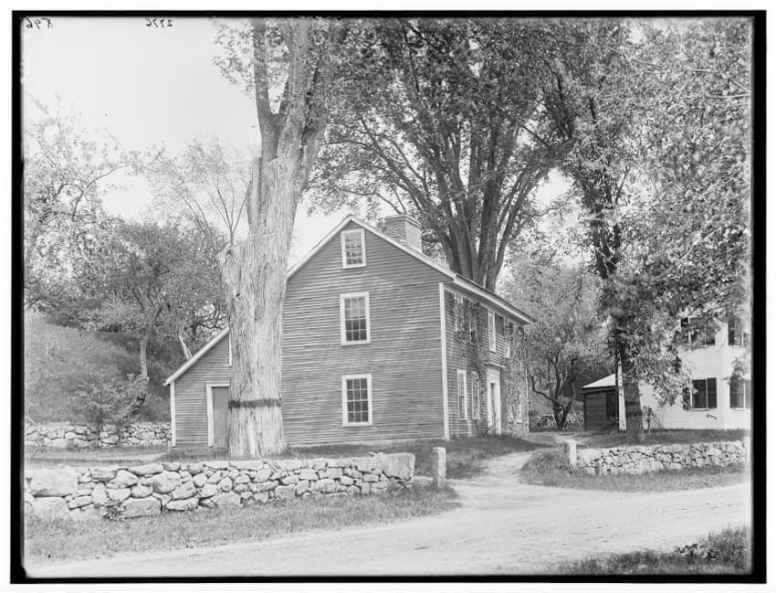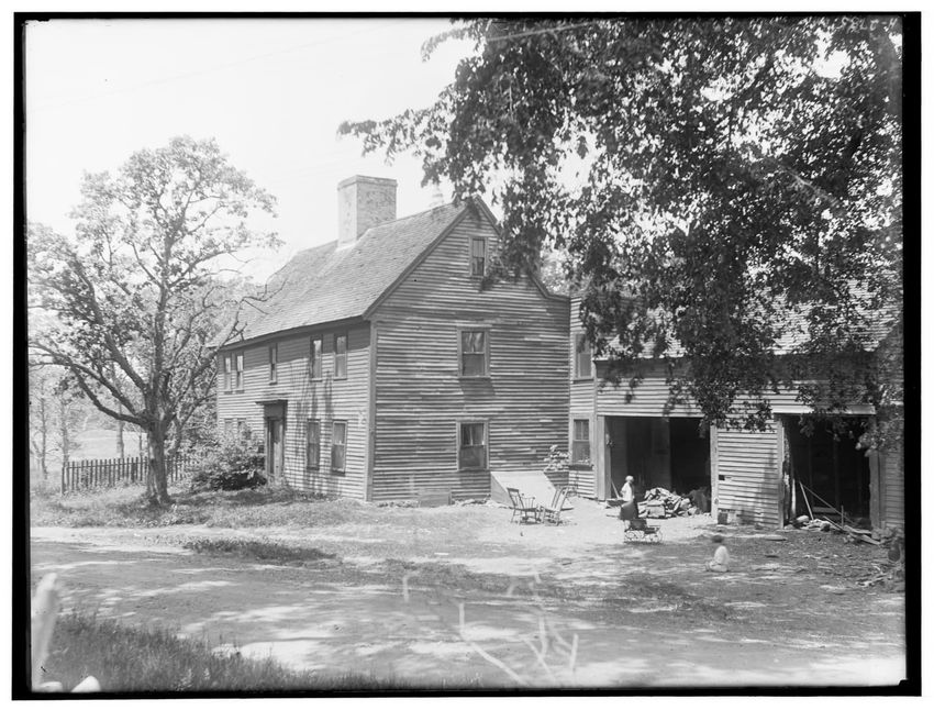 The image shows the Batchelder House in Wenham, Massachusetts. It features a wooden, two-story structure with a chimney, alongside an adjacent building, possibly a barn or shed, with open doors. Some chairs and a small amount of clutter are visible in the yard, as well as a few indistinct people eng...