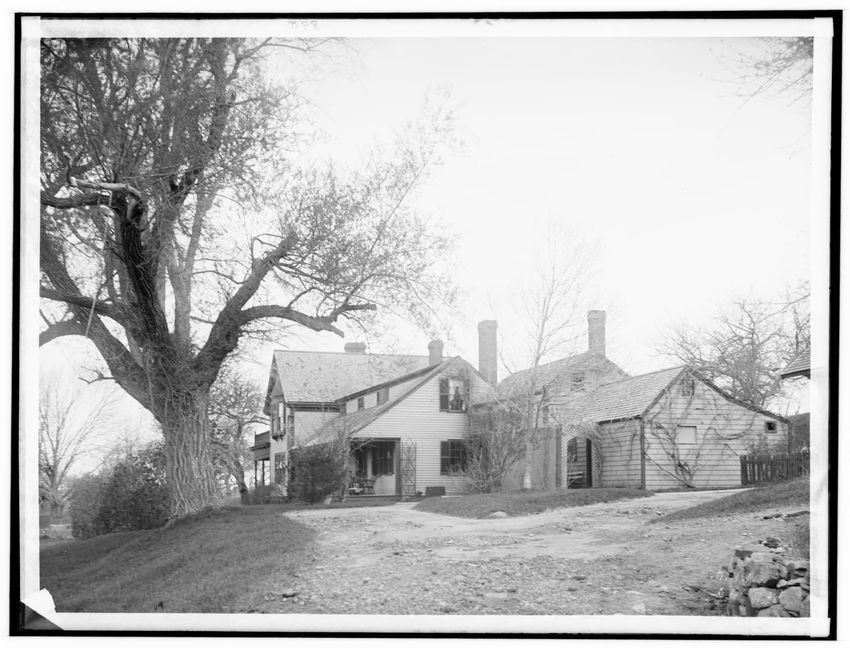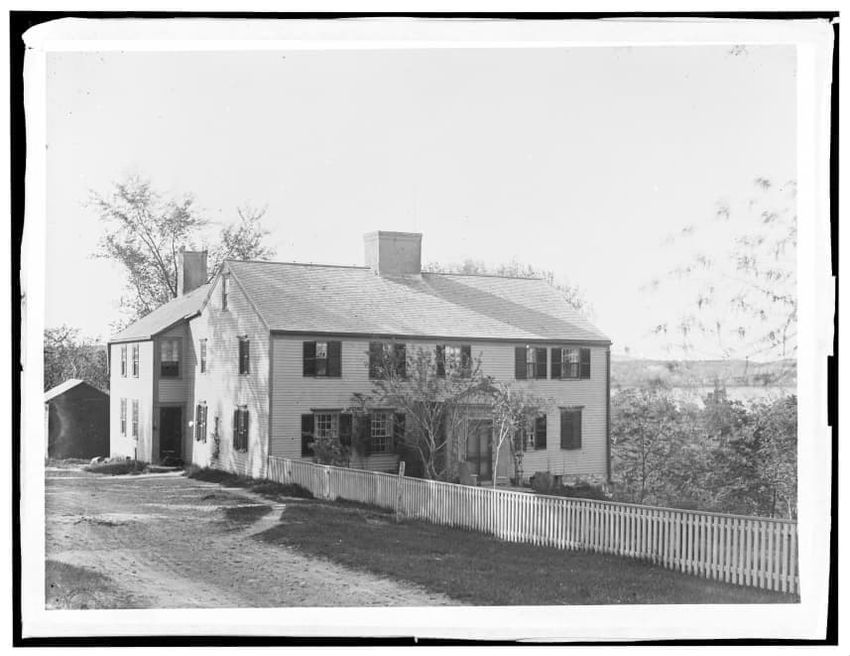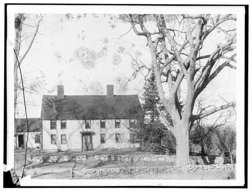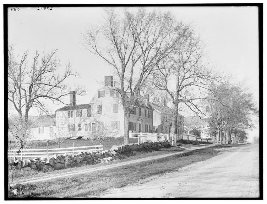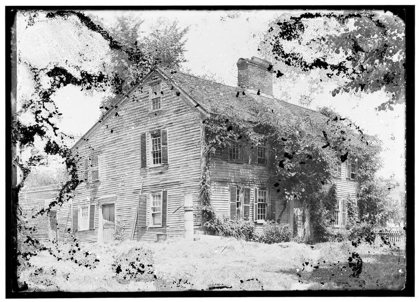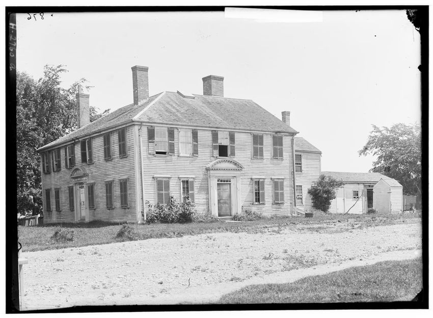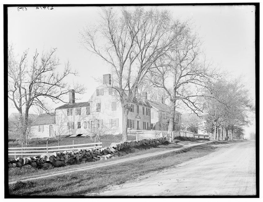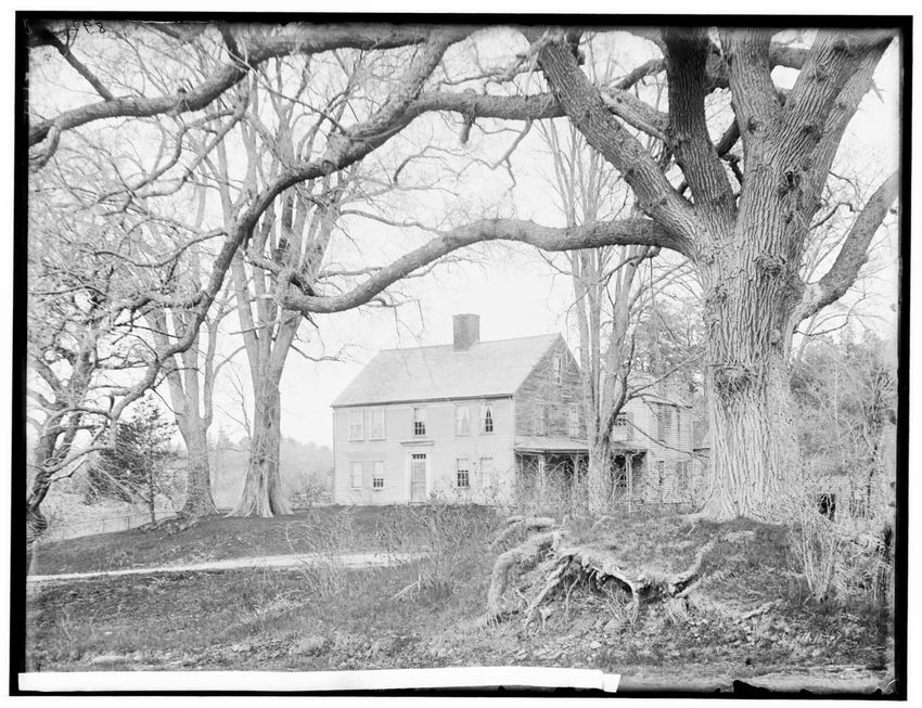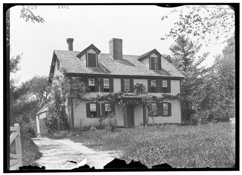 The image shows the Batchelder House in Wenham, Massachusetts. It features a wooden, two-story structure with a chimney, alongside an adjacent building, possibly a barn or shed, with open doors. Some chairs and a small amount of clutter are visible in the yard, as well as a few indistinct people eng...