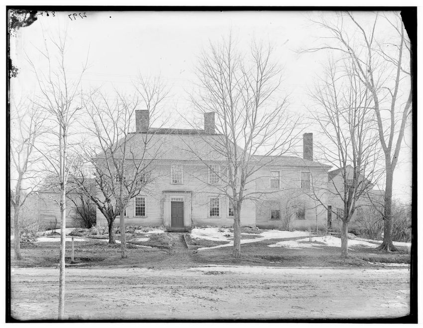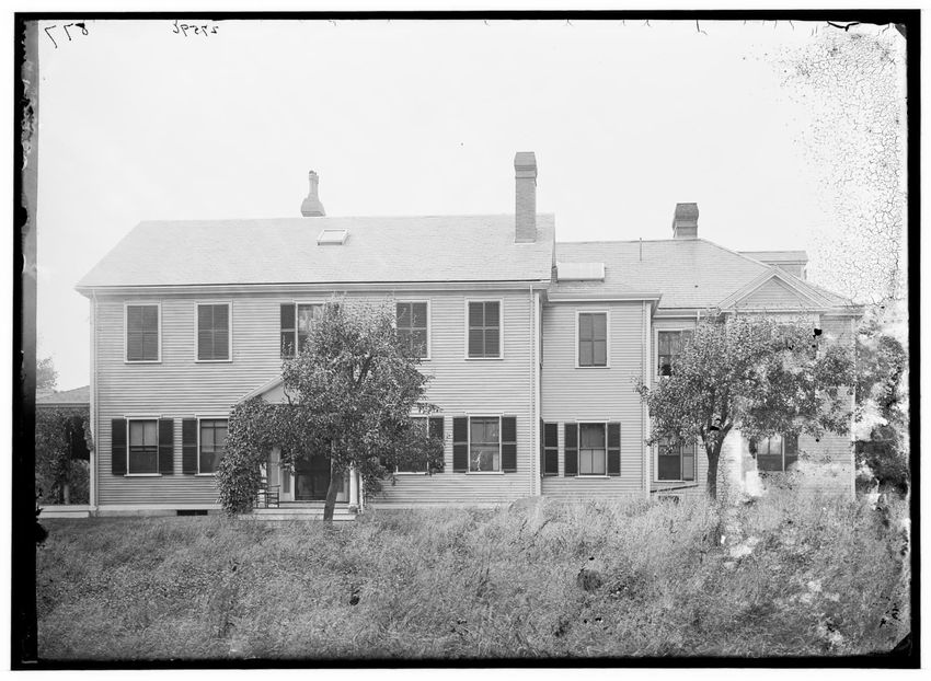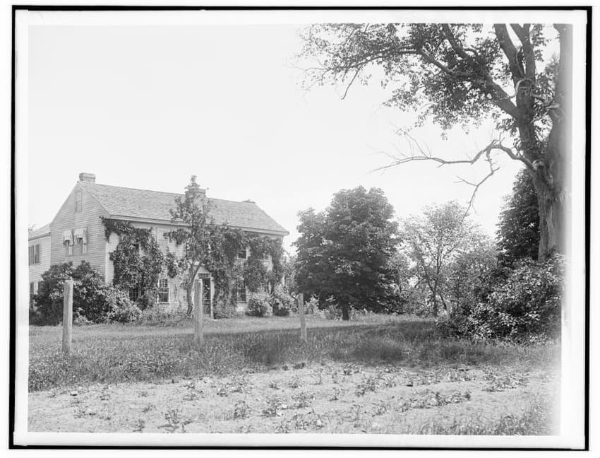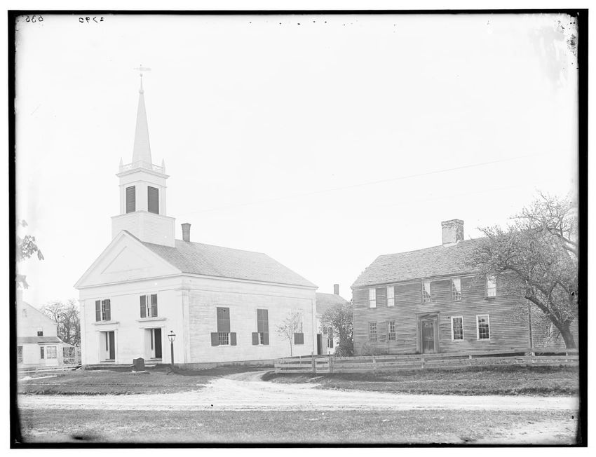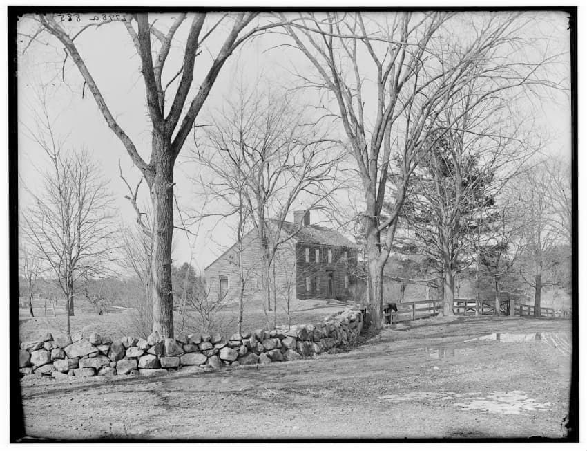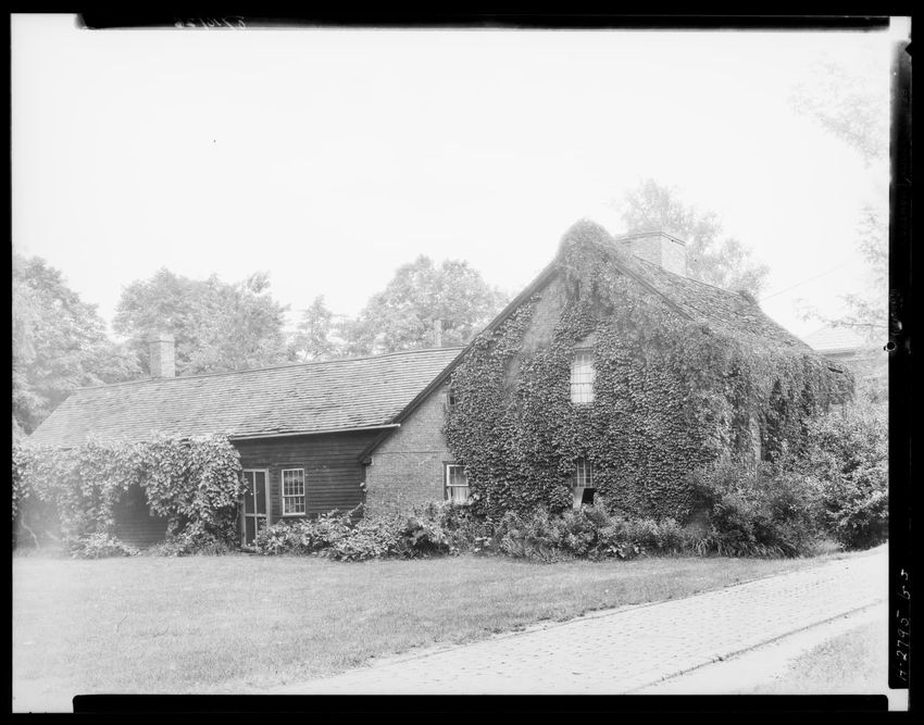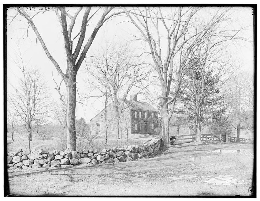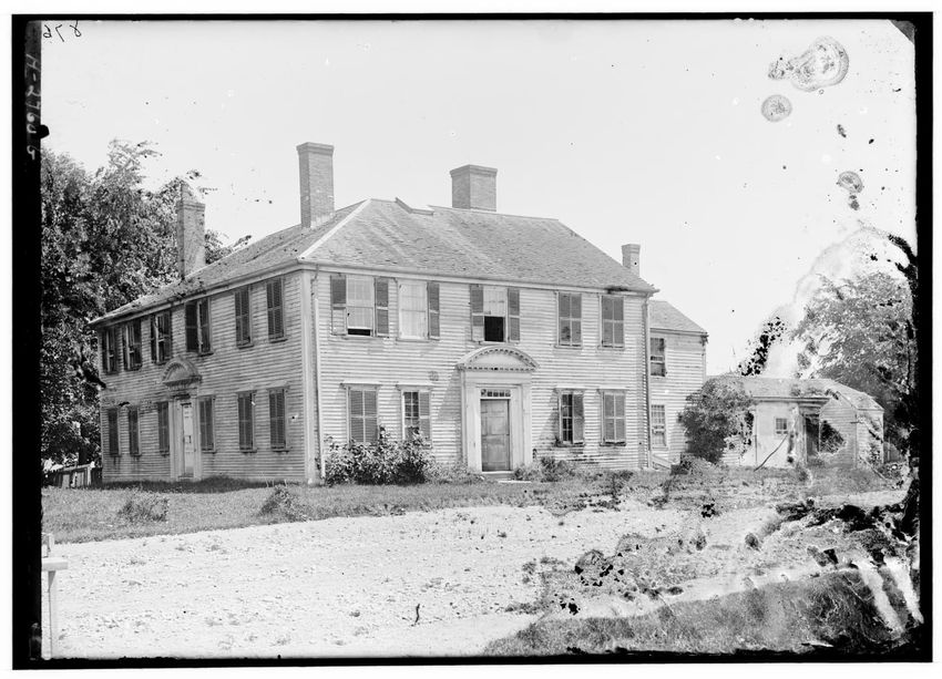 The image shows the Batchelder House in Wenham, Massachusetts. It features a wooden, two-story structure with a chimney, alongside an adjacent building, possibly a barn or shed, with open doors. Some chairs and a small amount of clutter are visible in the yard, as well as a few indistinct people eng...