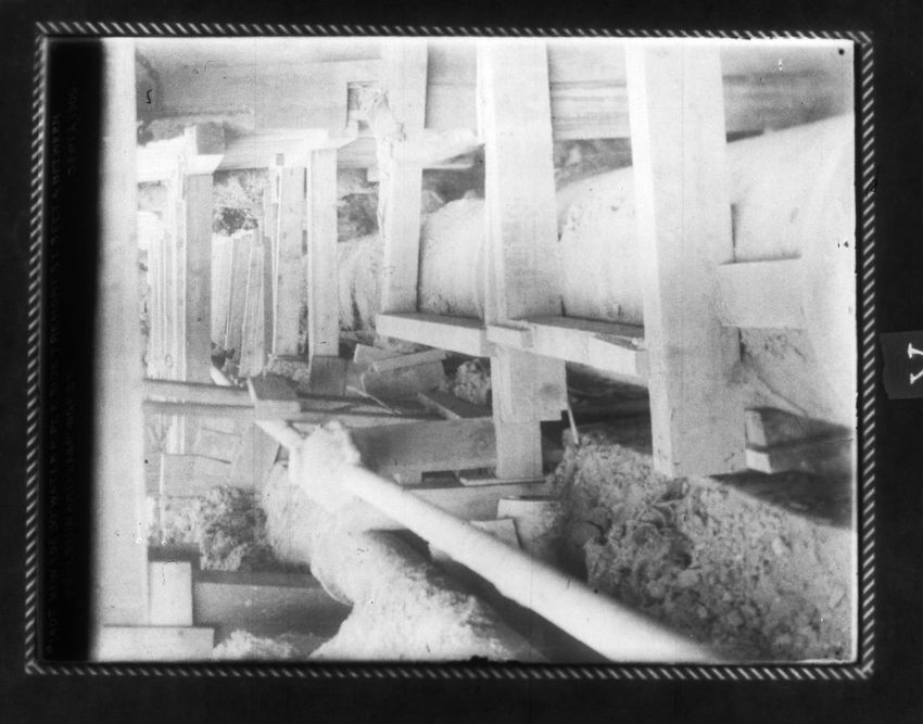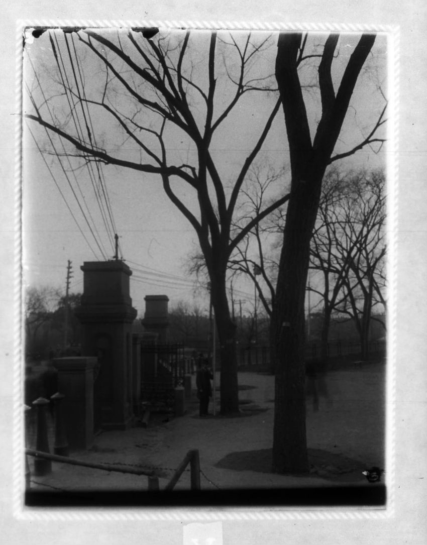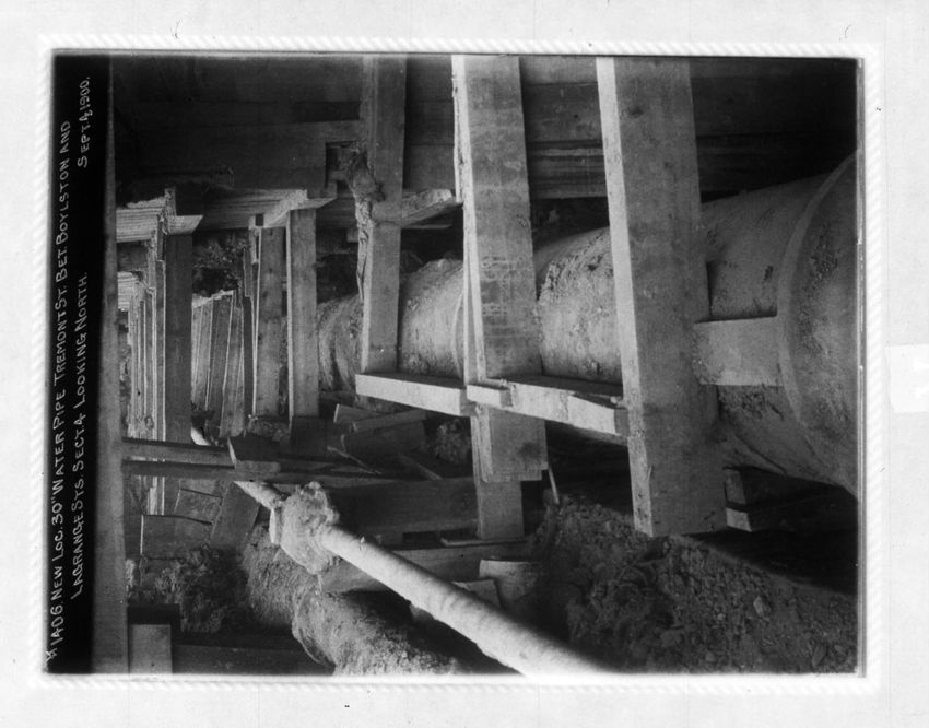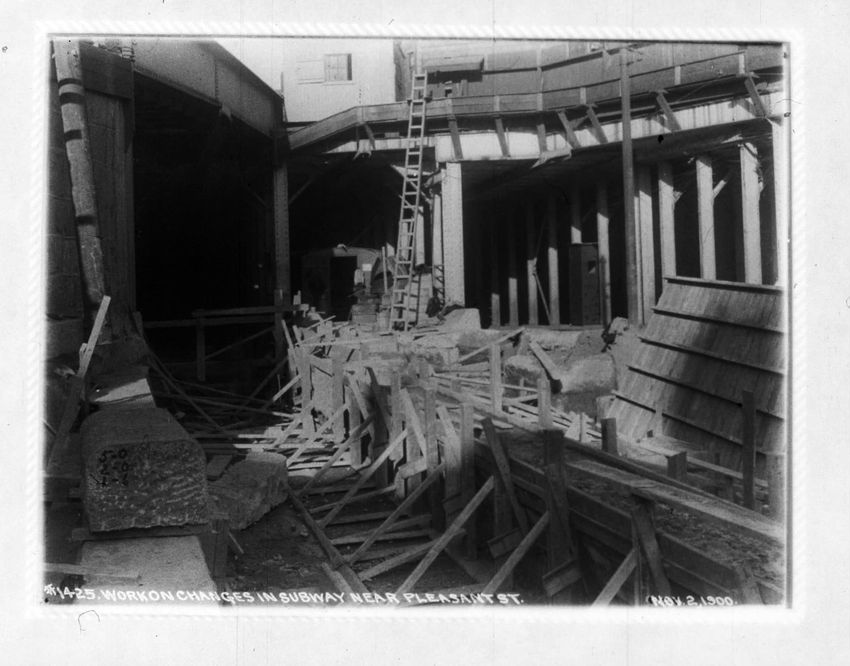 Horse-drawn vehicles move along Tremont Street next to Boylston Street Station.