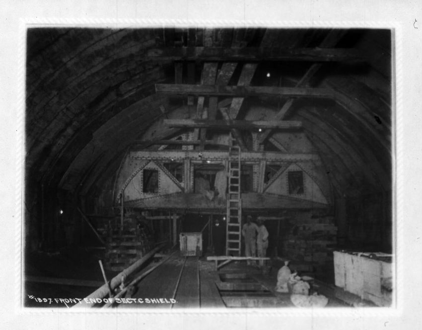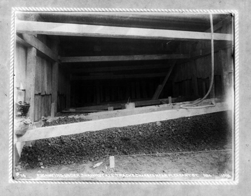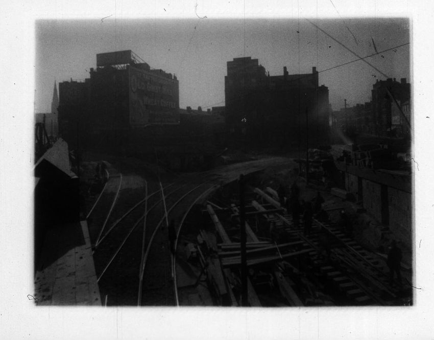 Streetcar tracks are seen outside the Scollay Square subway station entrance. To the left of the subway station is the Crawford House hotel. Magee furnaces and ranges are advertised on a large sign to the right of the station.