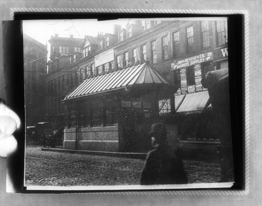 Horse-drawn vehicles stand near the Scollay Square subway station exit.
