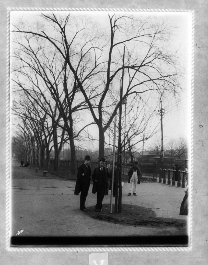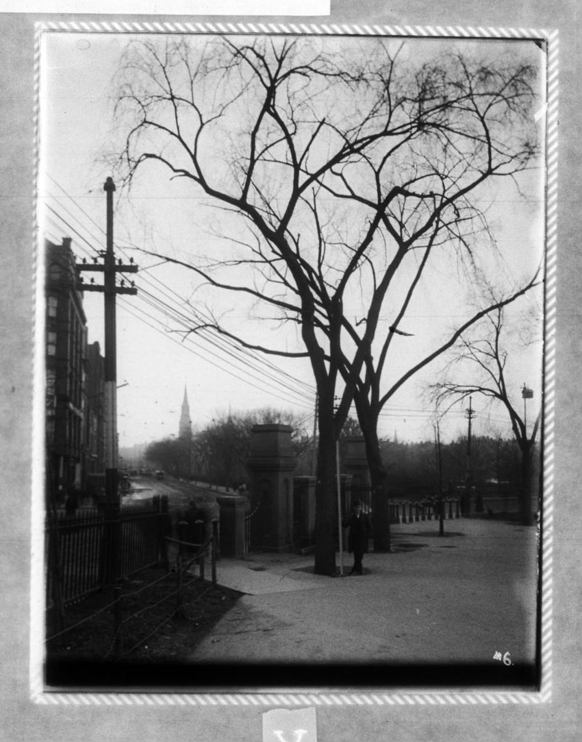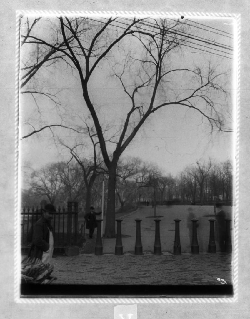 Pedestrians enter the Boston Common and walk along Tremont Mall at the intersection of West and Tremont Streets.