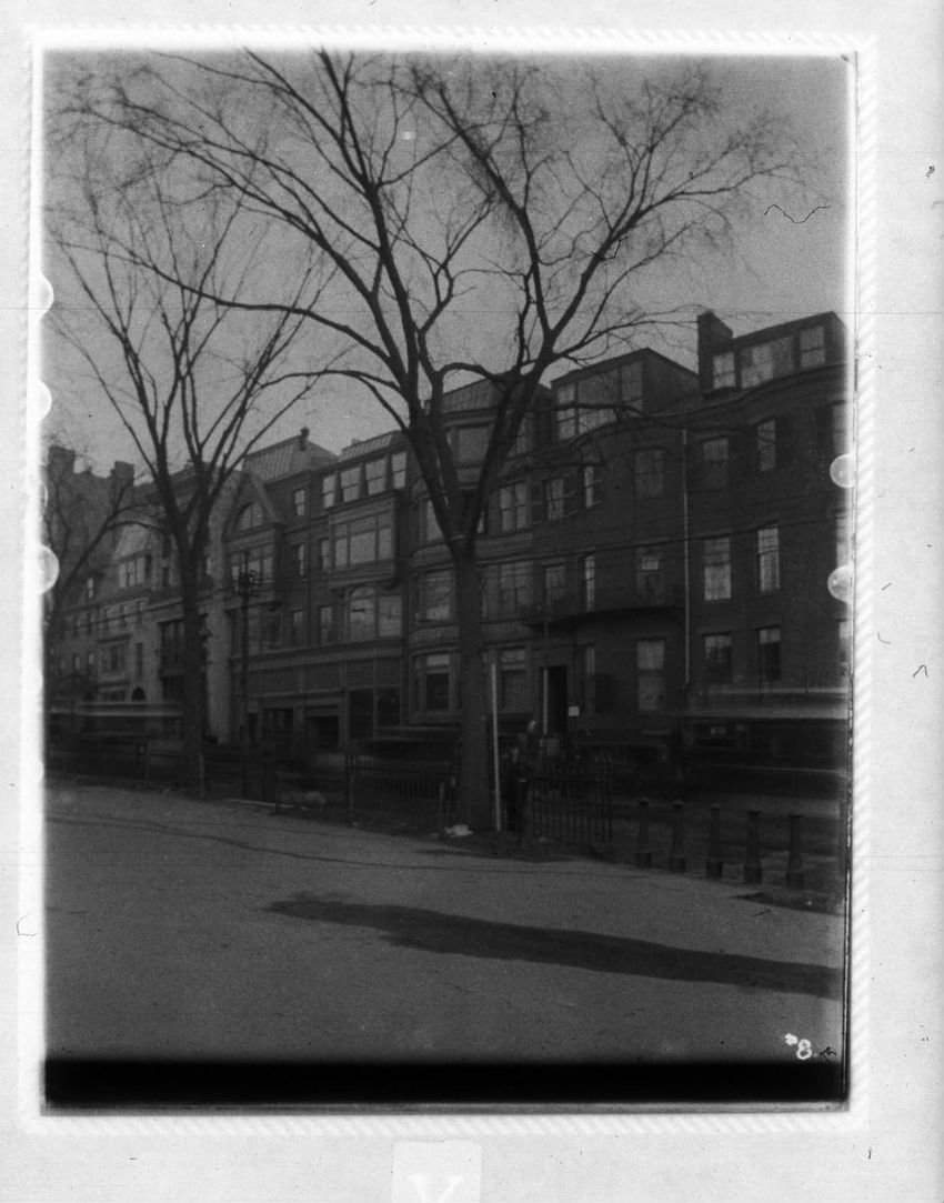 Awning covered store fronts can be seen the length of Tremont Street in this image.