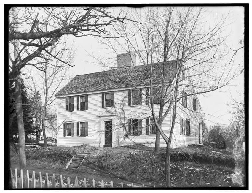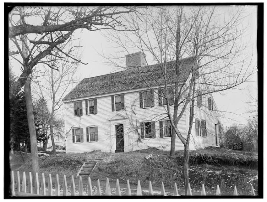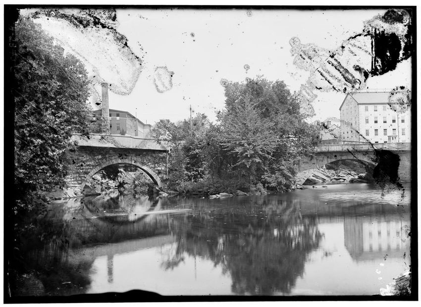 The image shows the Ballou Mill in Woonsocket, Rhode Island. In the foreground, there is a river with reflections of nearby trees, vegetation, and structures. A stone bridge with archways spans the river and the mill building can be seen in the background on the right side, partially obscured by tre...