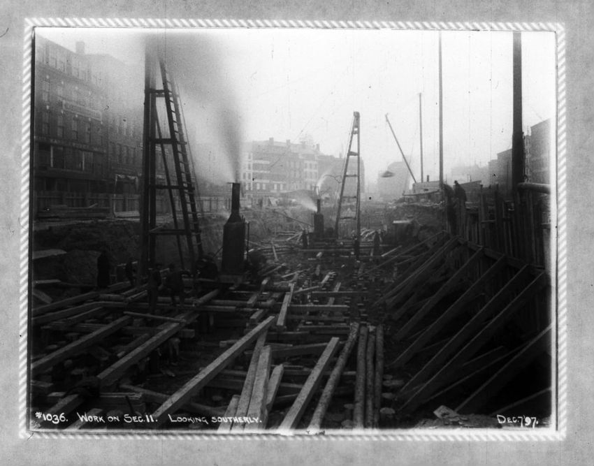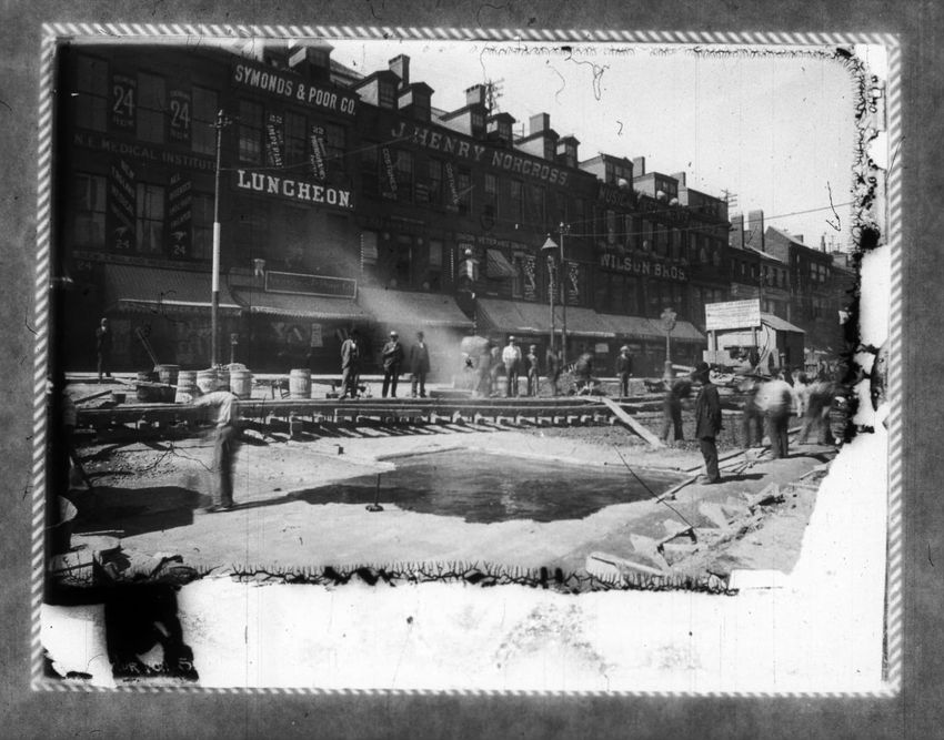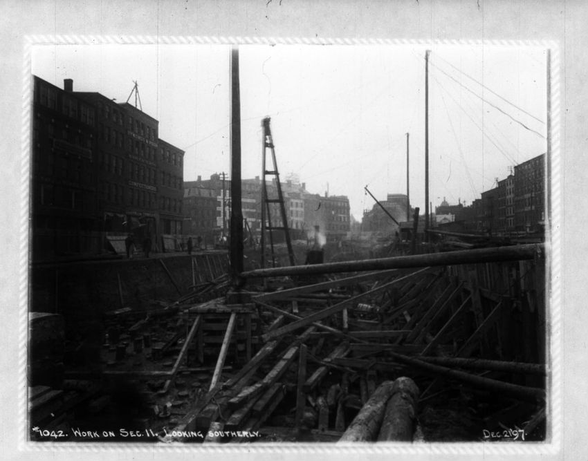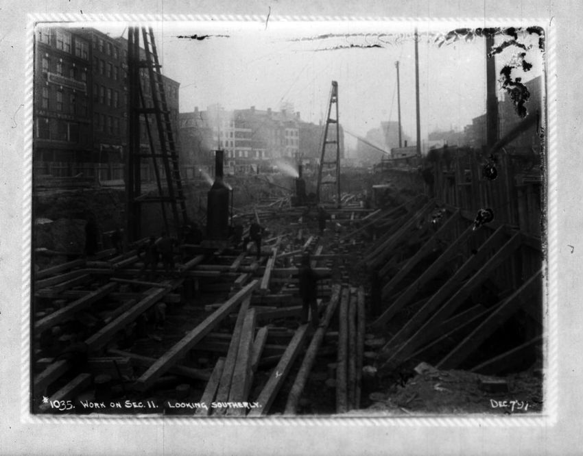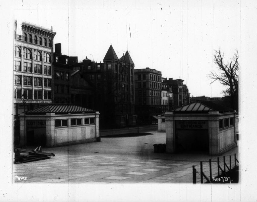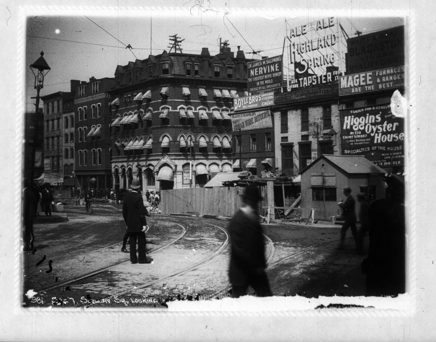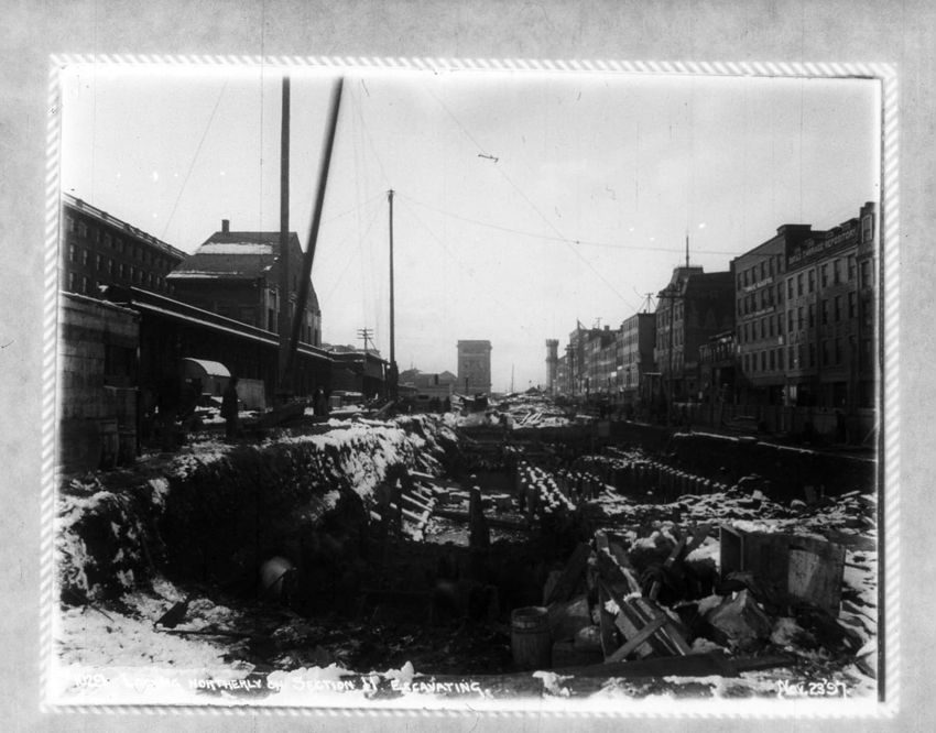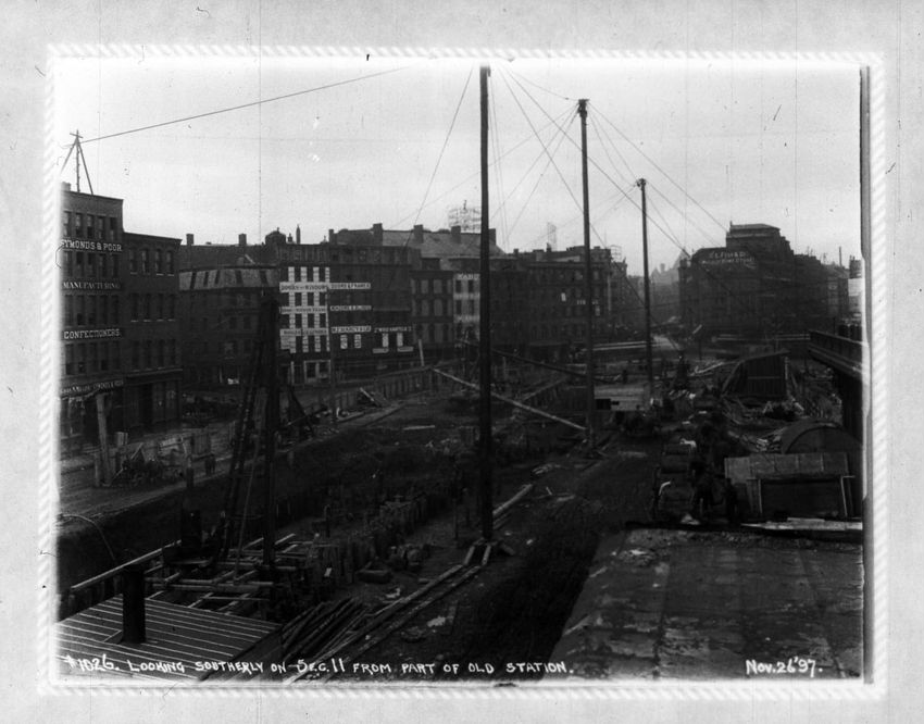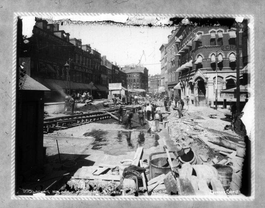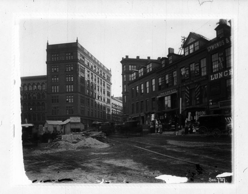 The Crawford House hotel, with awnings, is seen directly across the square in this image of subway construction work. Signs for restaurants, appliance stores and ales can be seen on the right side of the image.