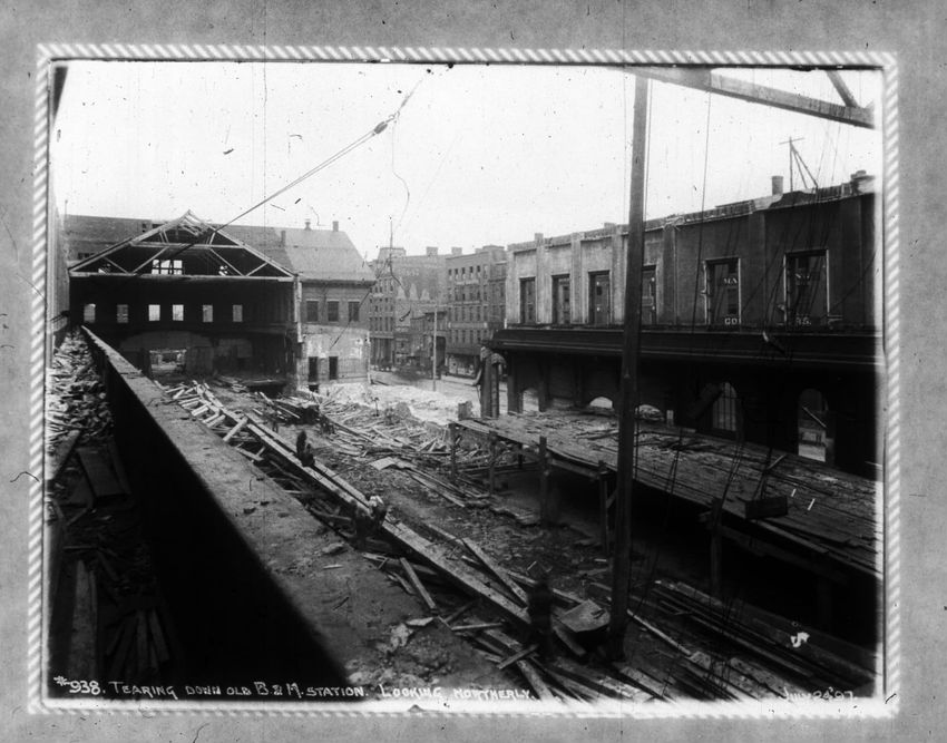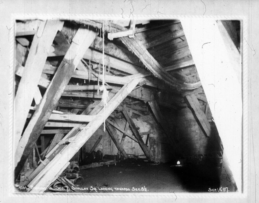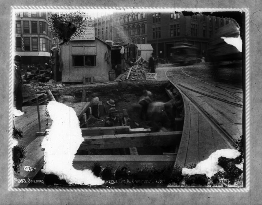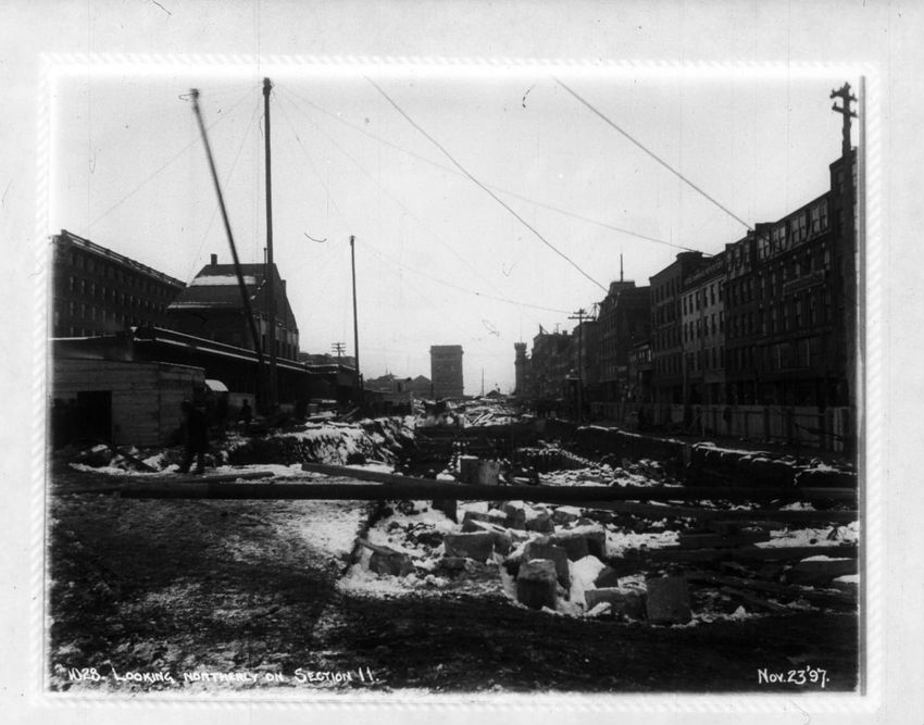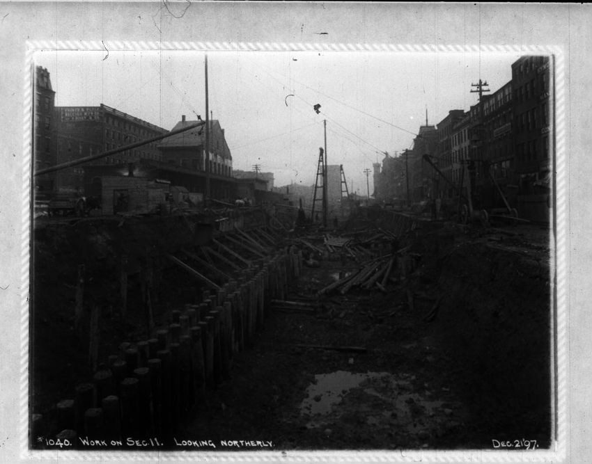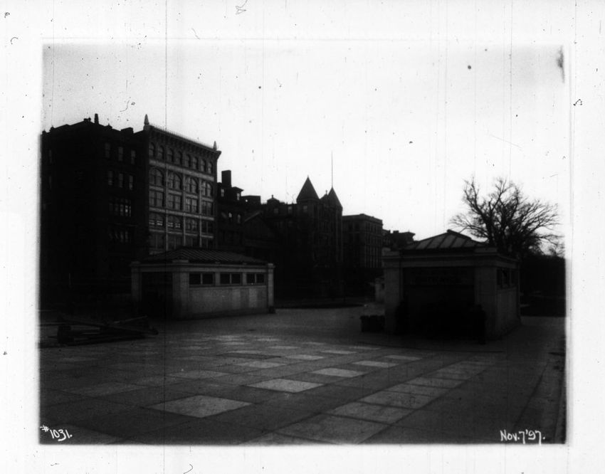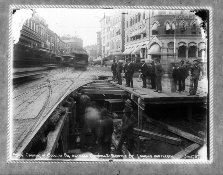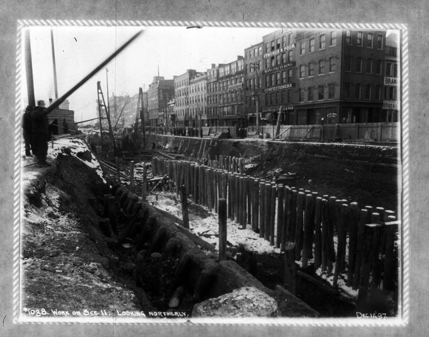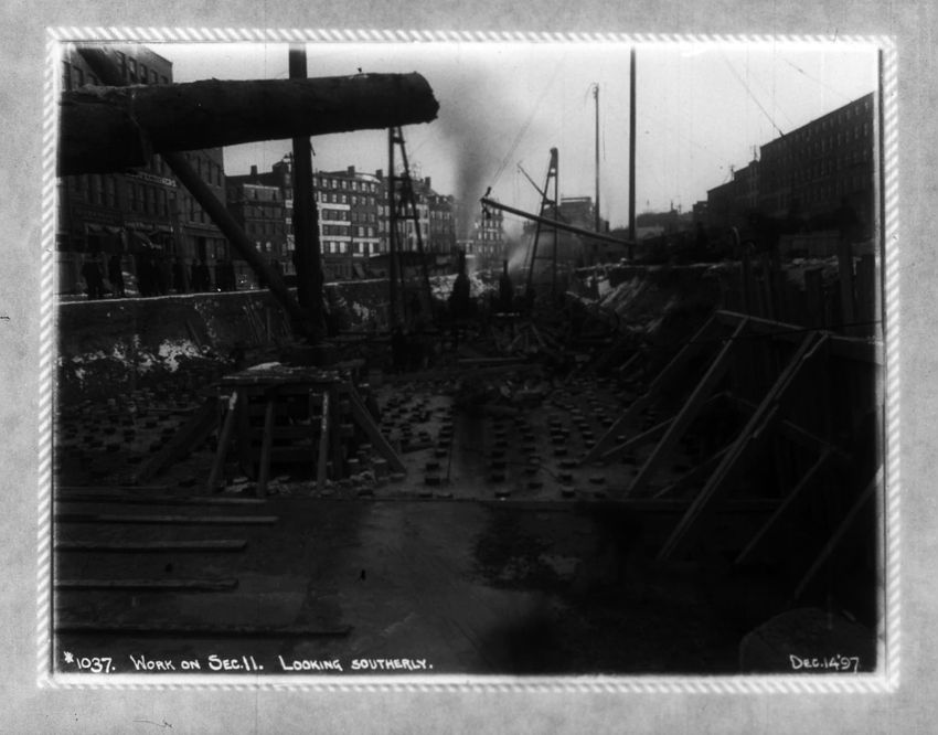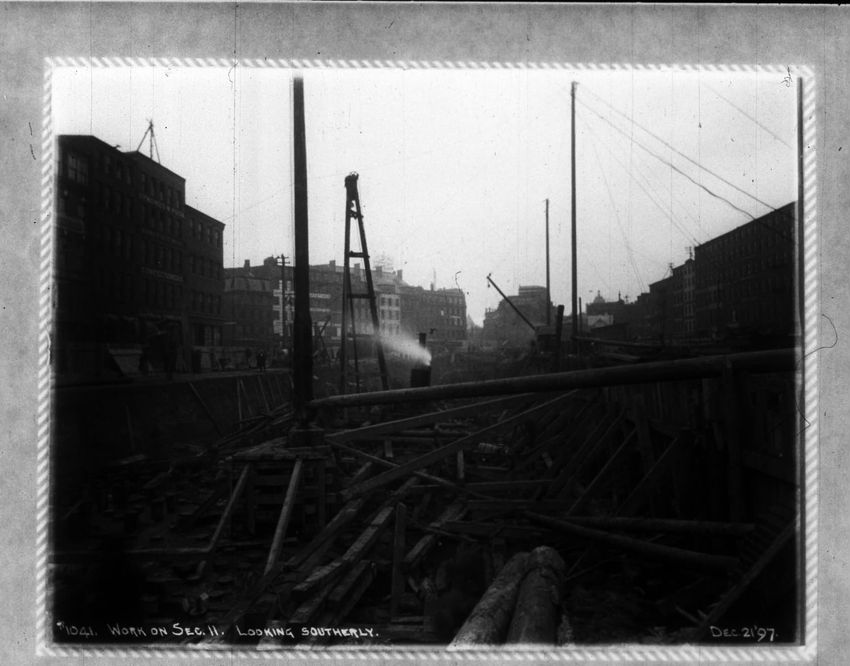 The Crawford House hotel, with awnings, is seen directly across the square in this image of subway construction work. Signs for restaurants, appliance stores and ales can be seen on the right side of the image.