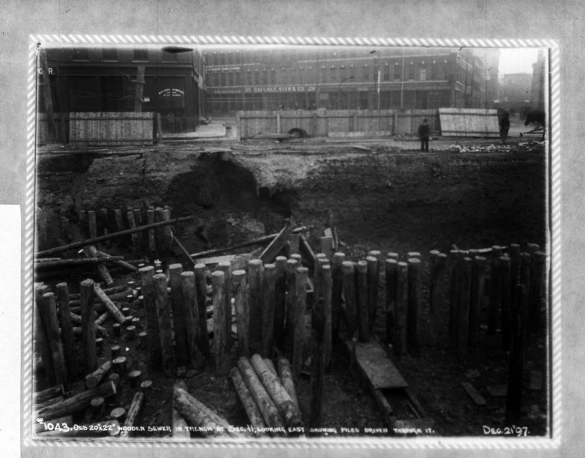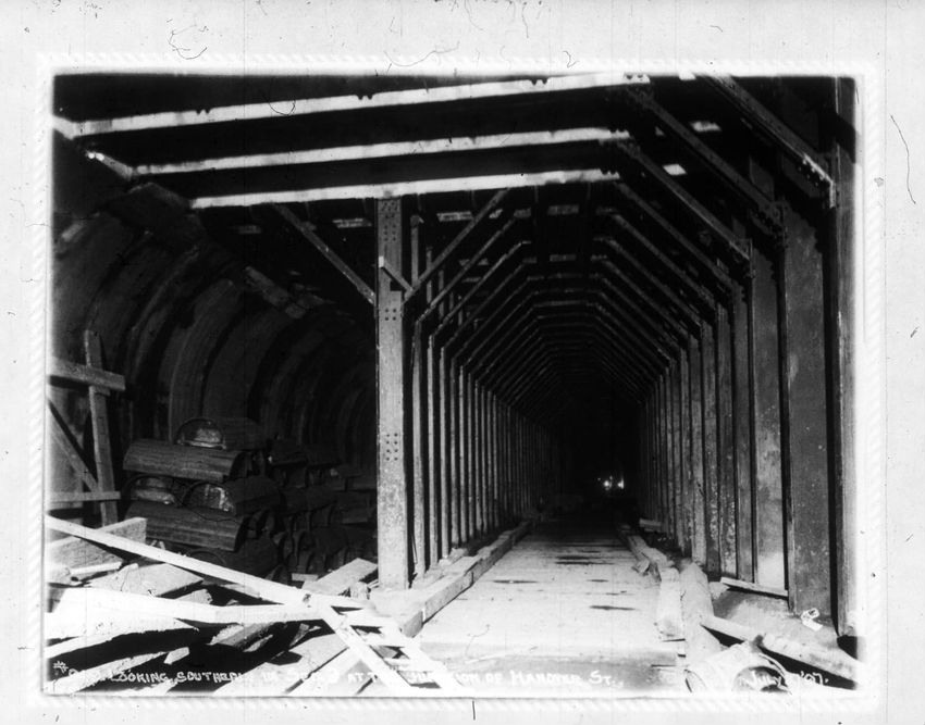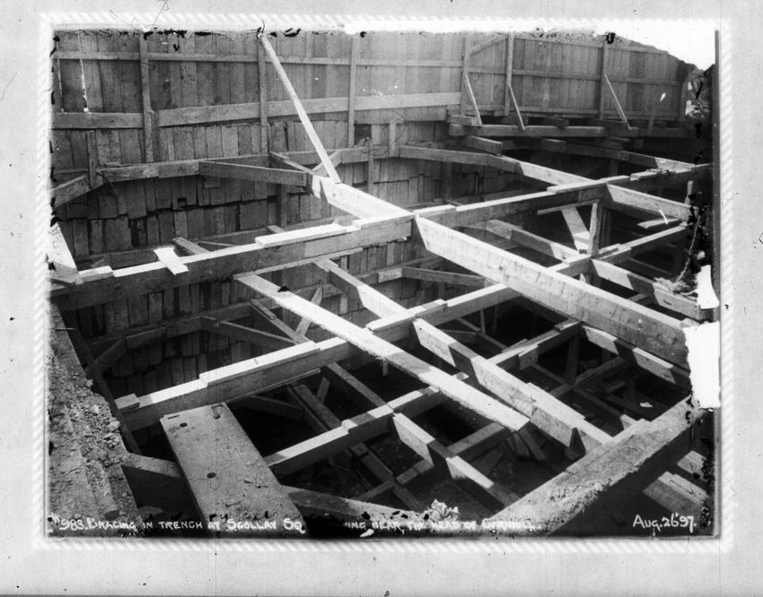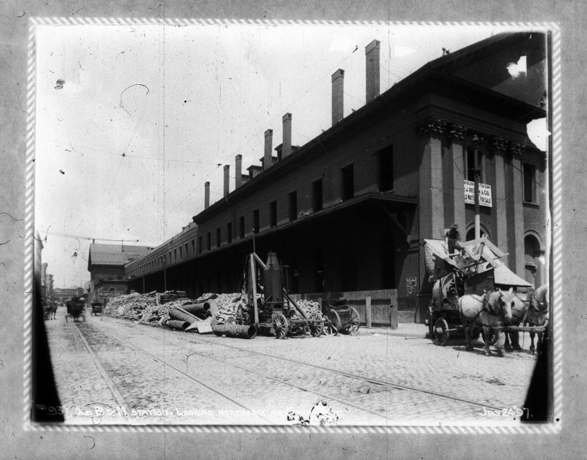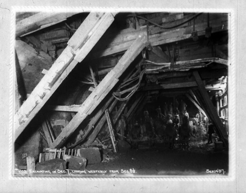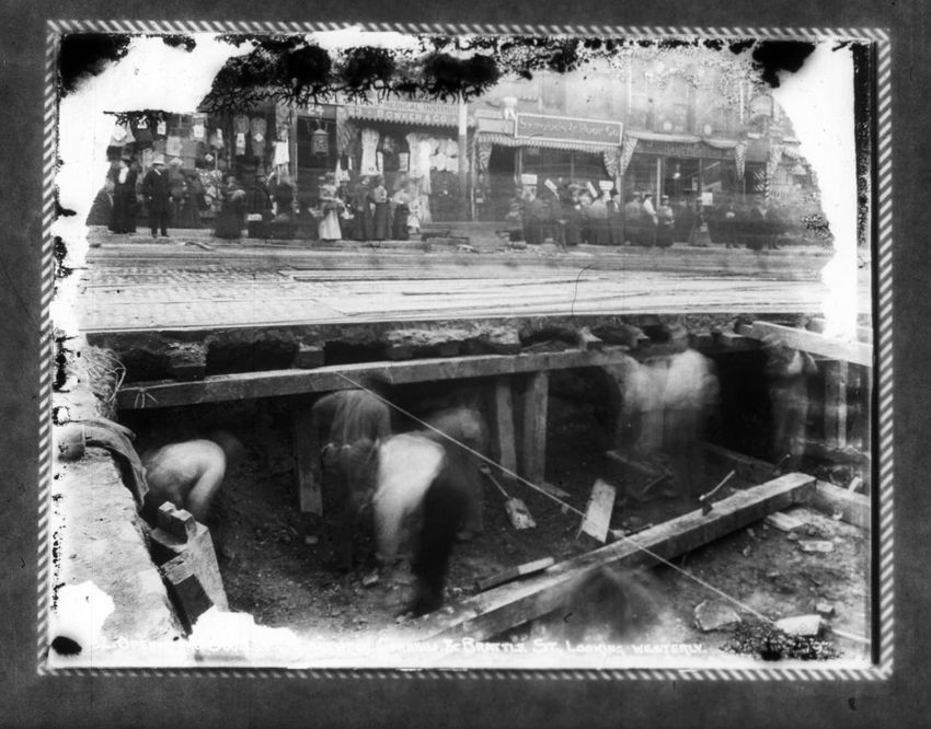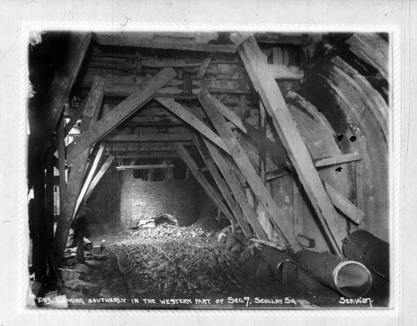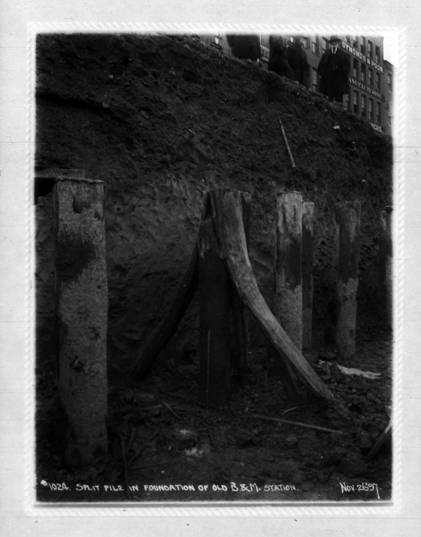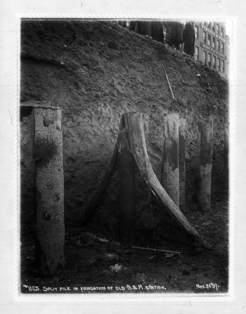 The Crawford House hotel, with awnings, is seen directly across the square in this image of subway construction work. Signs for restaurants, appliance stores and ales can be seen on the right side of the image.