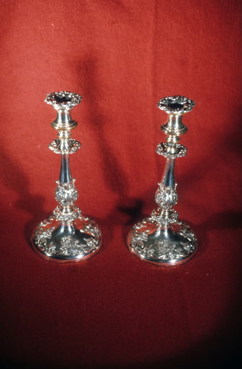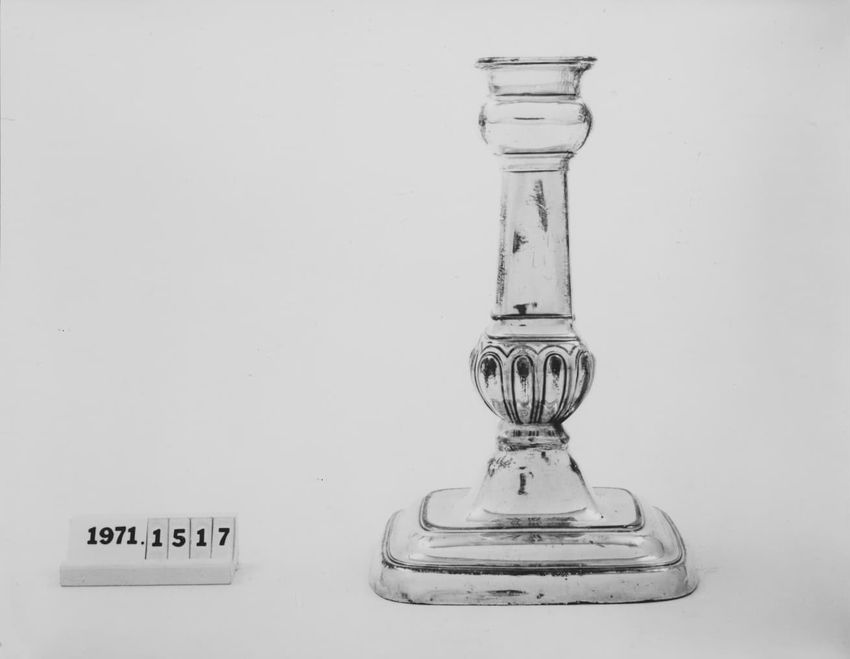 Circular stepped base with cast foliate and floral border, surmounted by a floral knop. Bulbous baluster stem with leafage followed by a floral knop. Circular socket, removable floral bobeche and a weighted base.