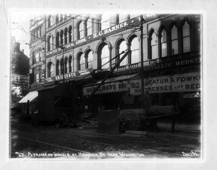Subway construction in Haymarket Square is in the foreground of the image. In the background is Webster Cook & Company, furniture, at 90 Canal Street.