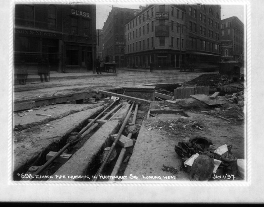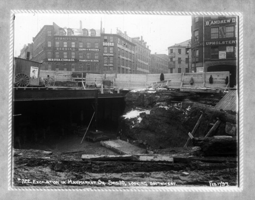 Subway work in Haymarket Square can be seen with the Boston & Maine Railroad Station in the background.