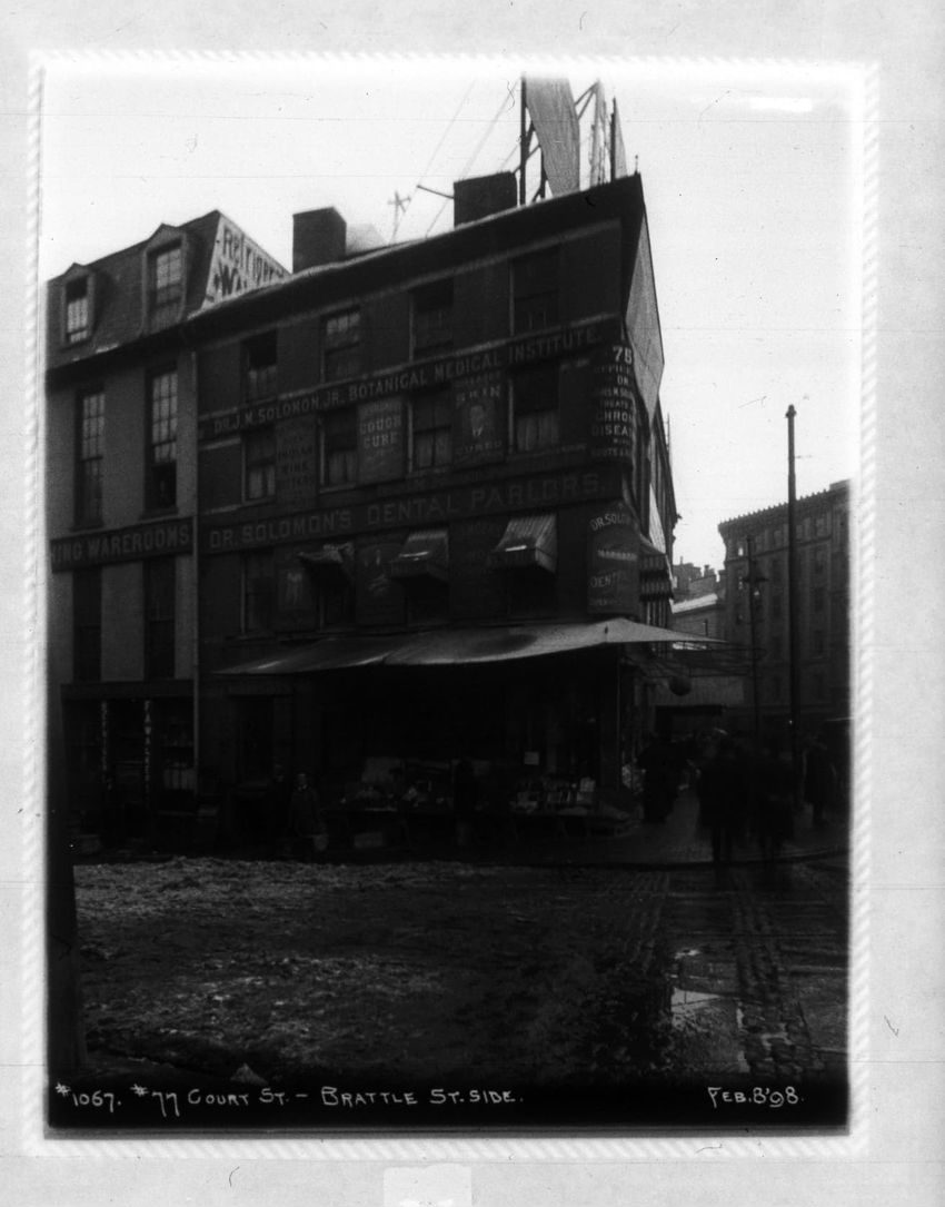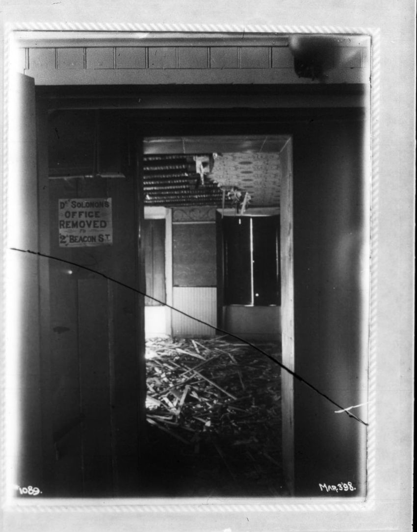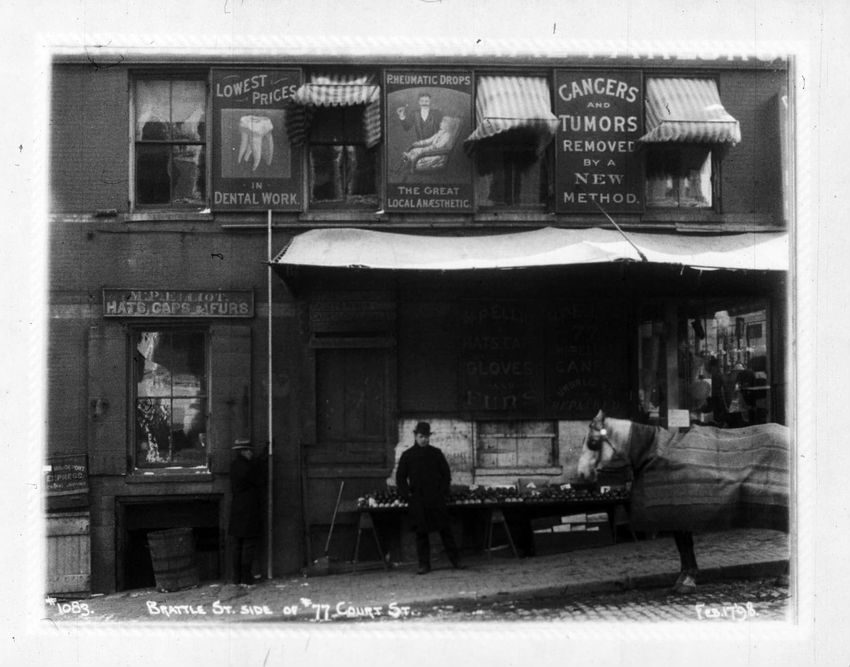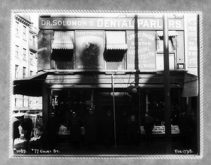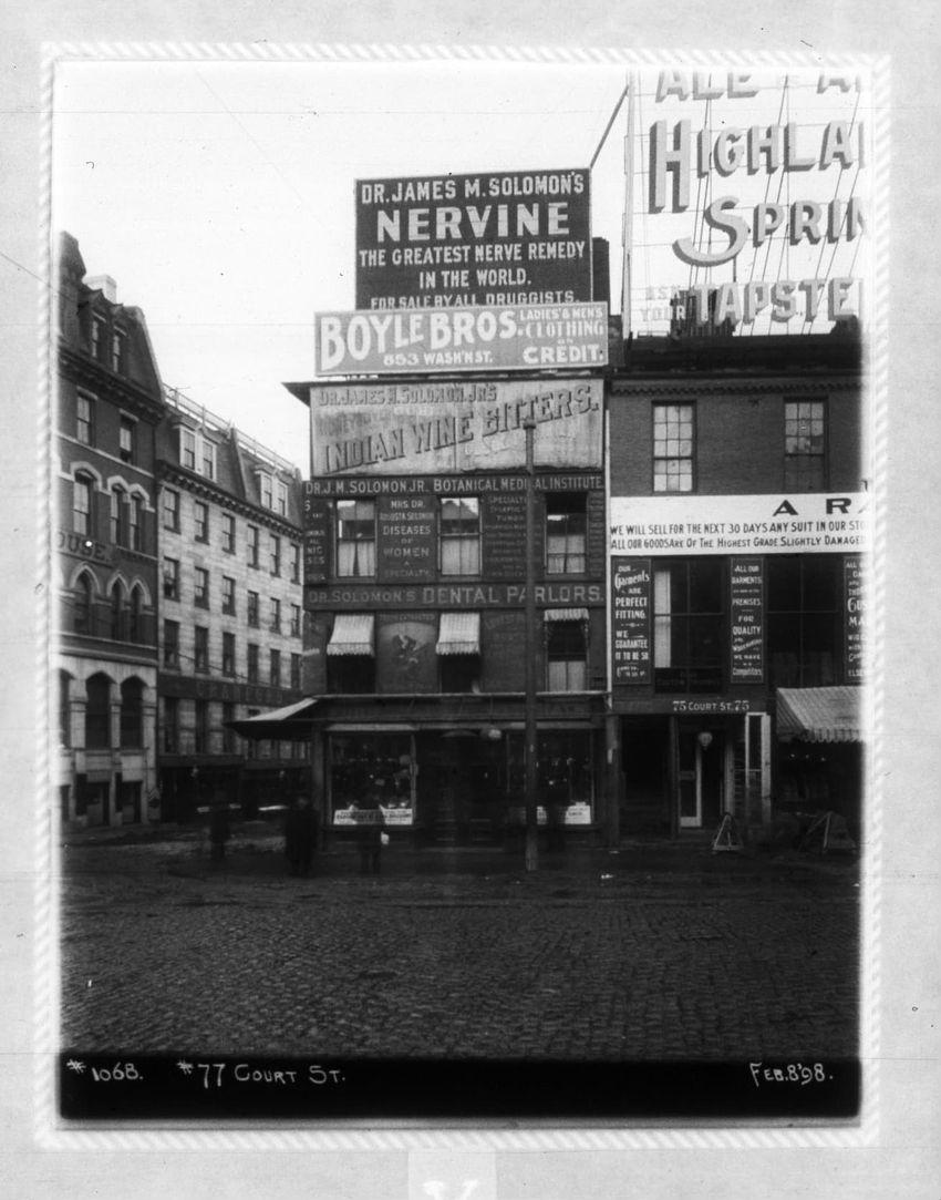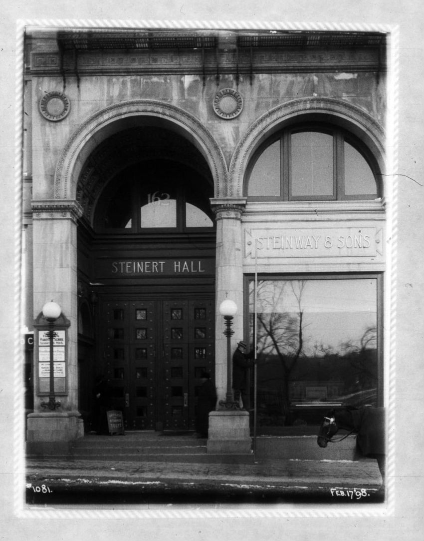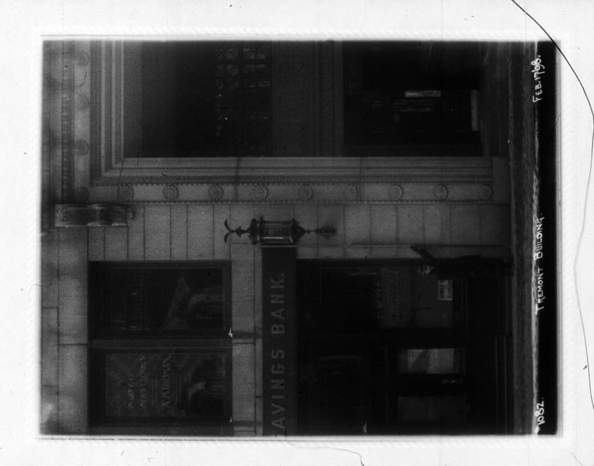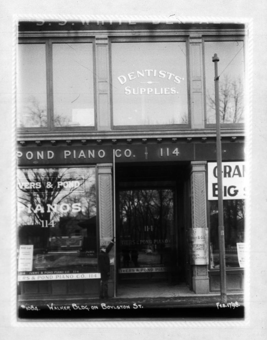 The Pond Piano Company storefront can be seen at 114 Boylston Street. The S.S. White Dental Manufacturing Company is above it. Alternate title: Walker Bldg. rod at 16'