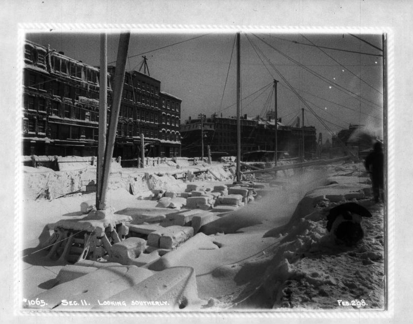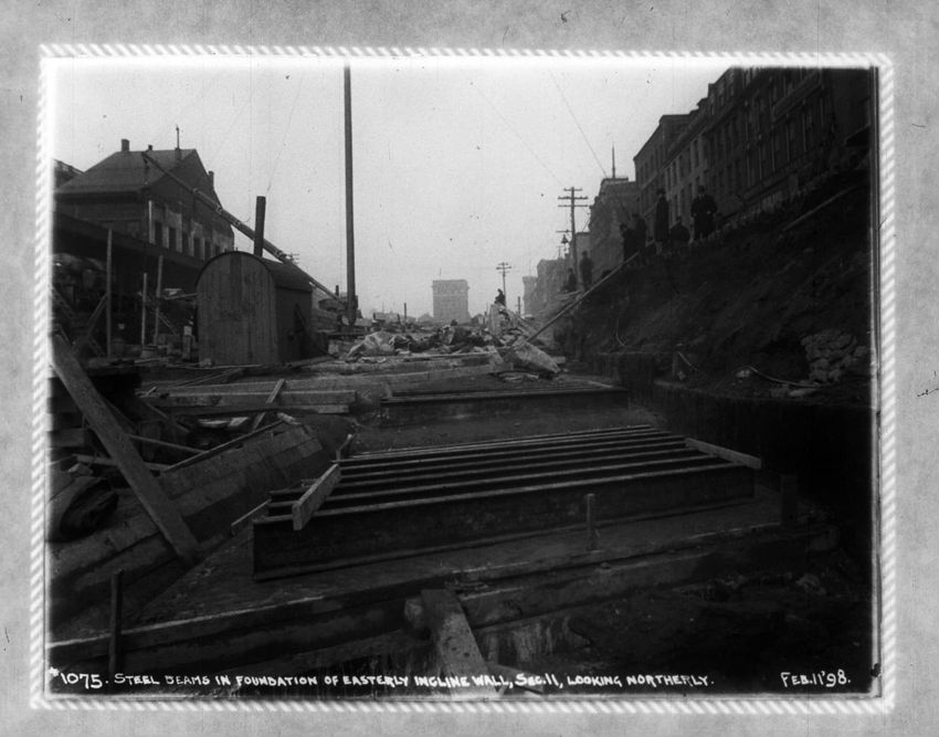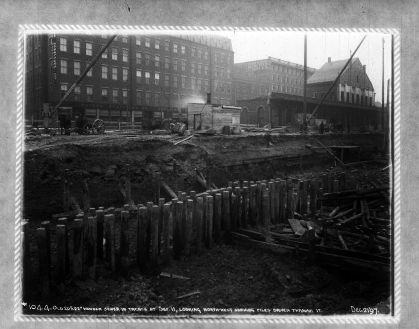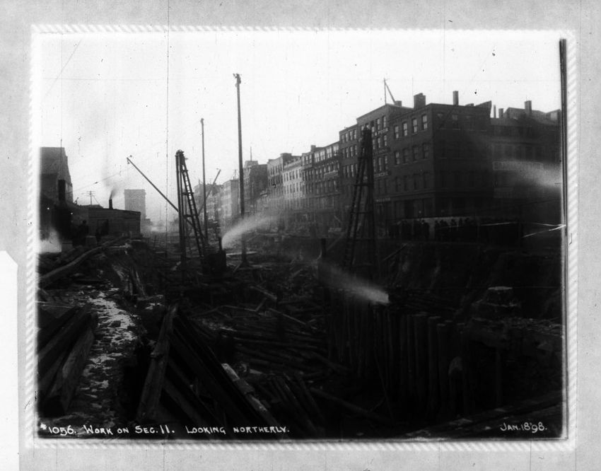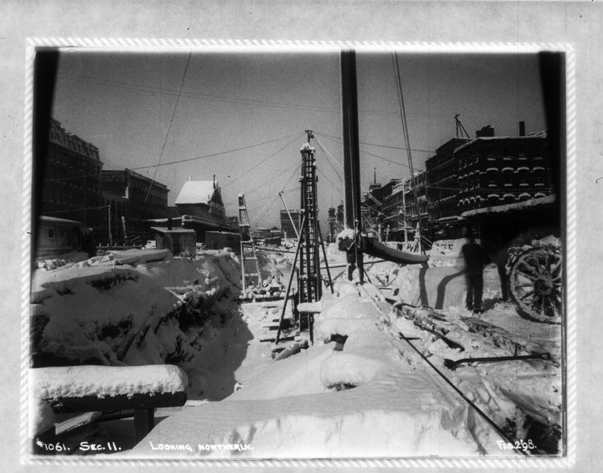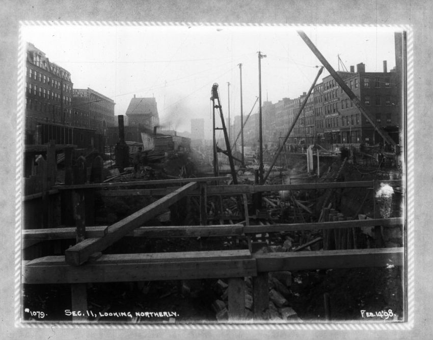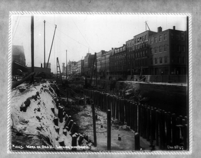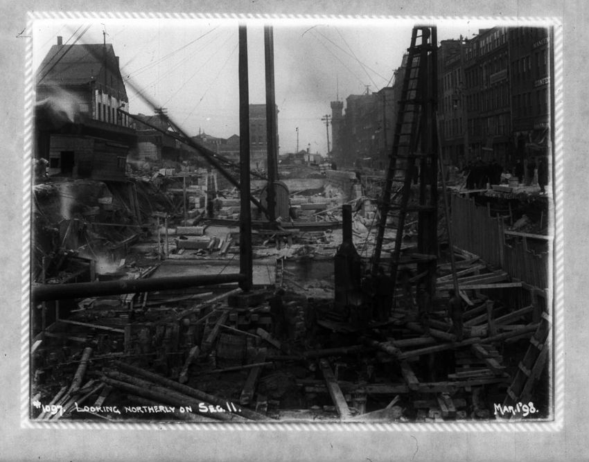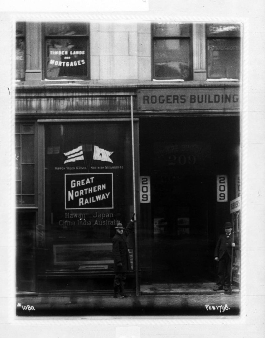 Pedestrians stand in fron of the Great Northern Railway ticket office in the Rogers Building at 209 Washington Street.