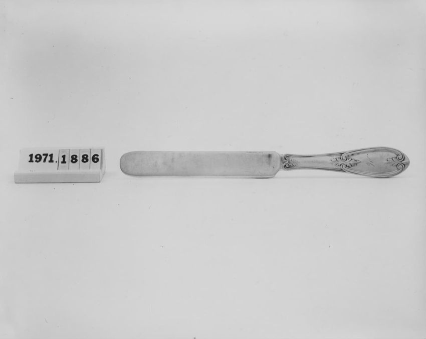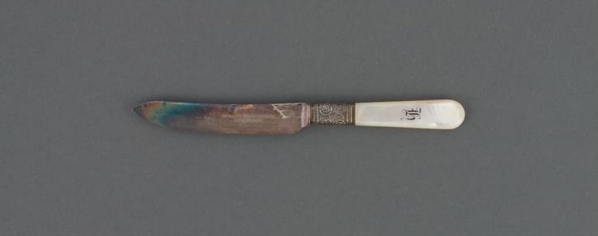 Silver dinner knife with a pointed oval handle and a rounded blade. Olive pattern.
