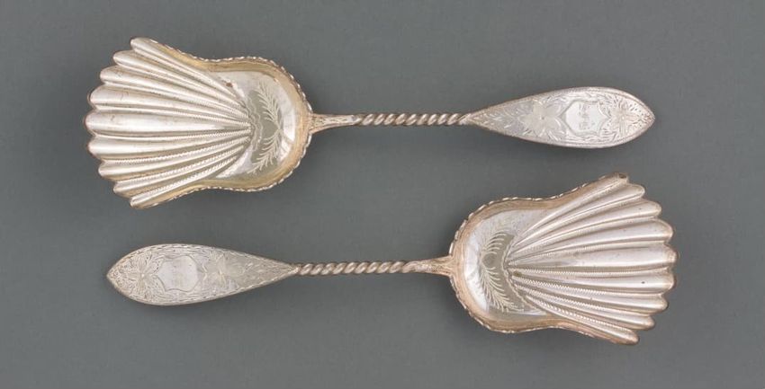 Silver serving spoon. Pointed handle with a twisted shaft. Shovel shaped bowl with scalloped edges. Bright cut floral and foliate design.