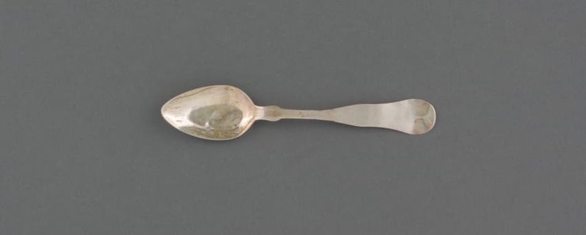 Silver teaspoon. Fiddle handle with pointed shoulders. Pointed oval bowl.