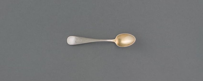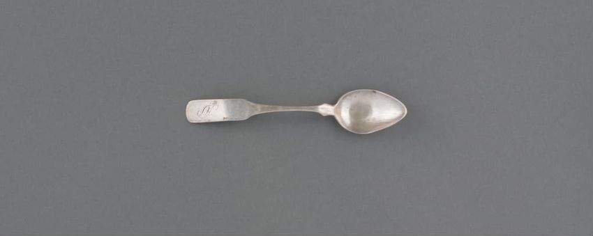 Silver teaspoon with a rounded handle, pointed shoulders, and a pointed oval bowl.